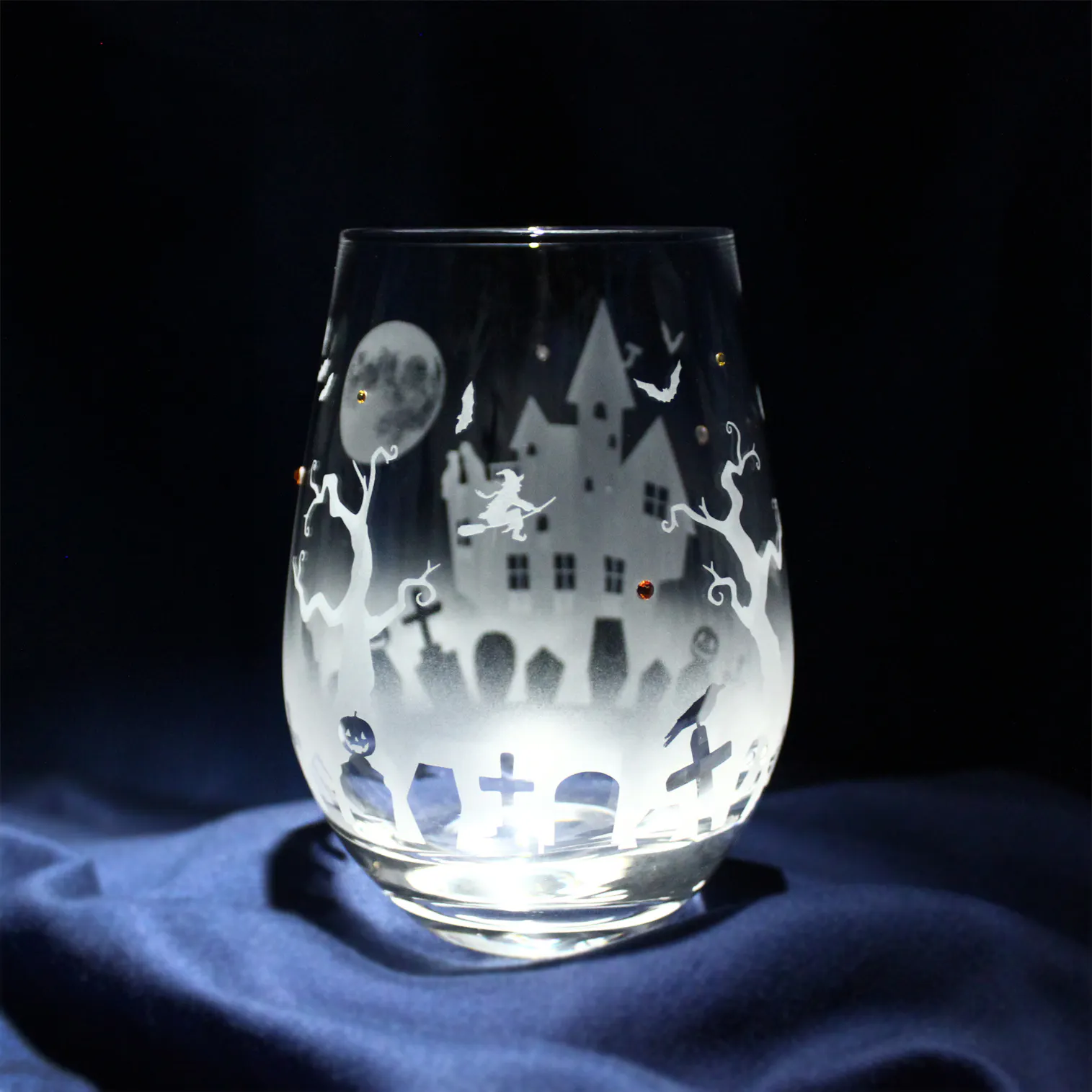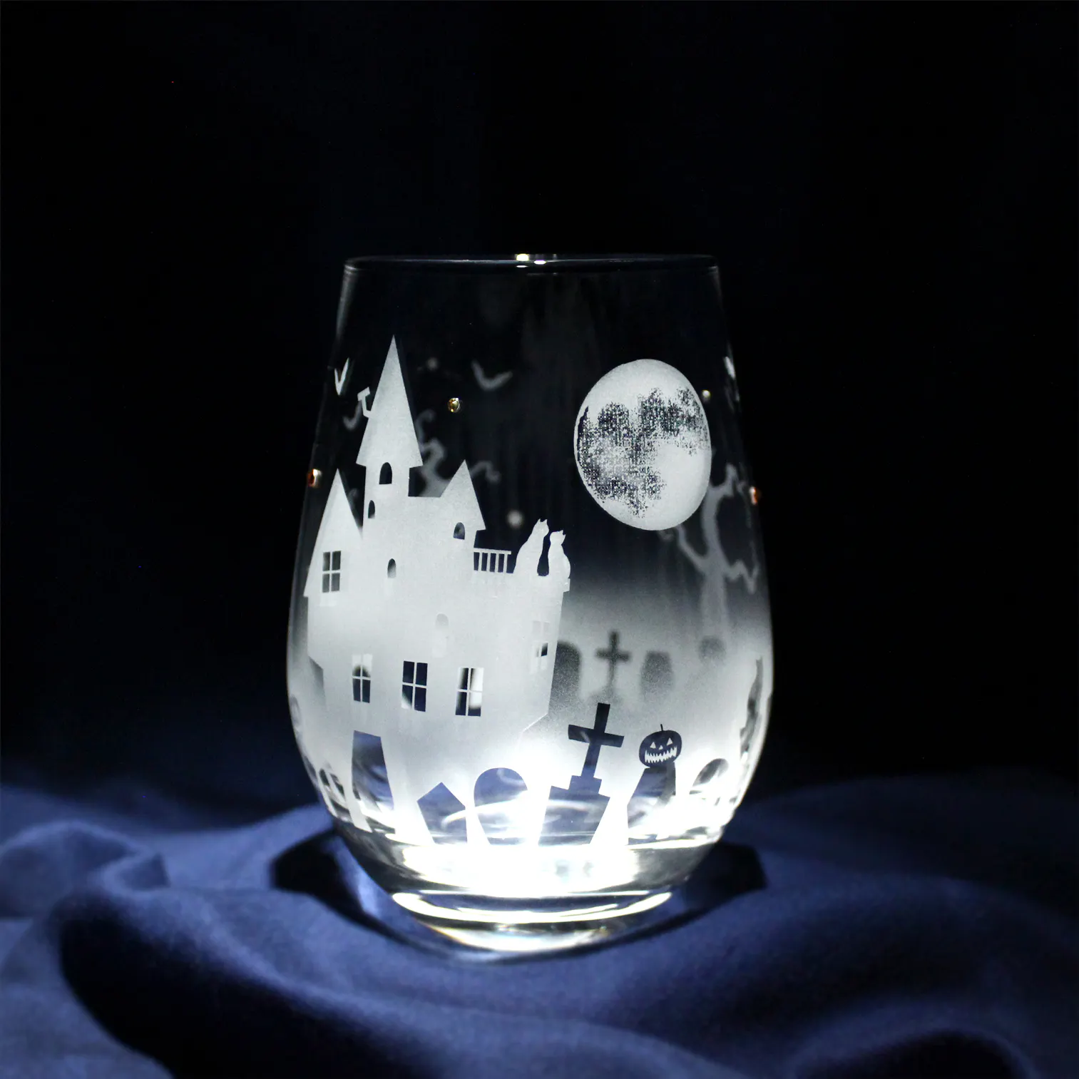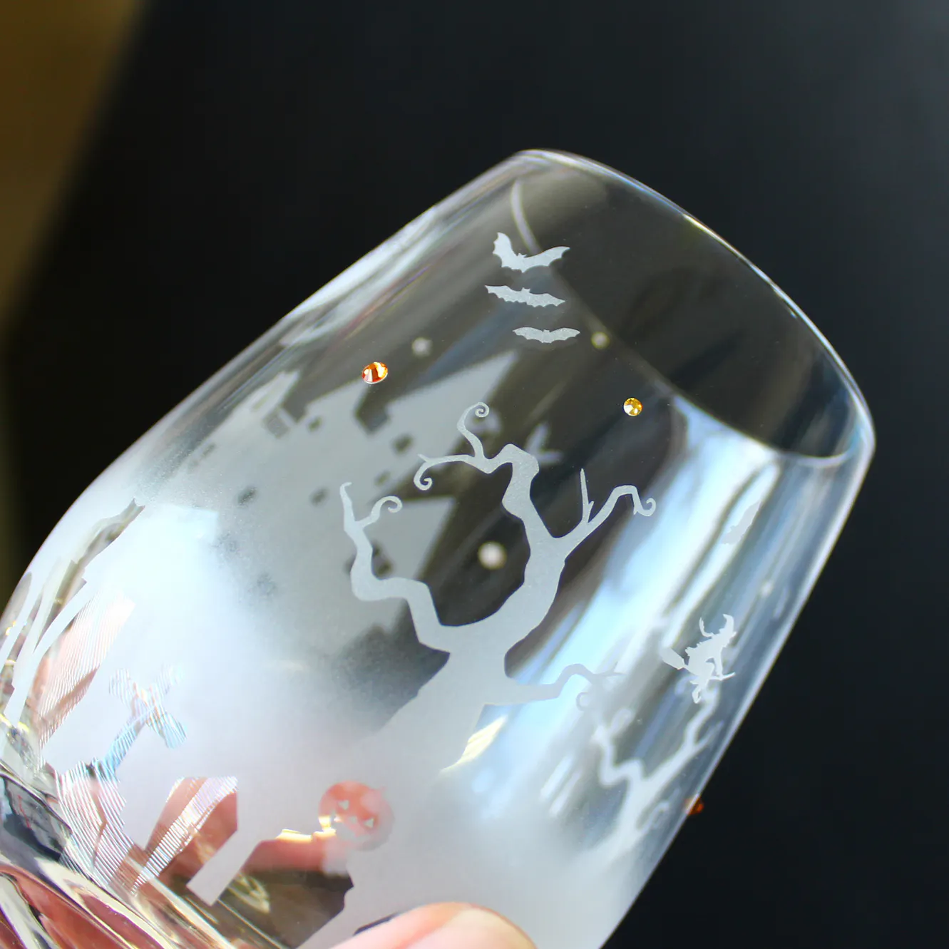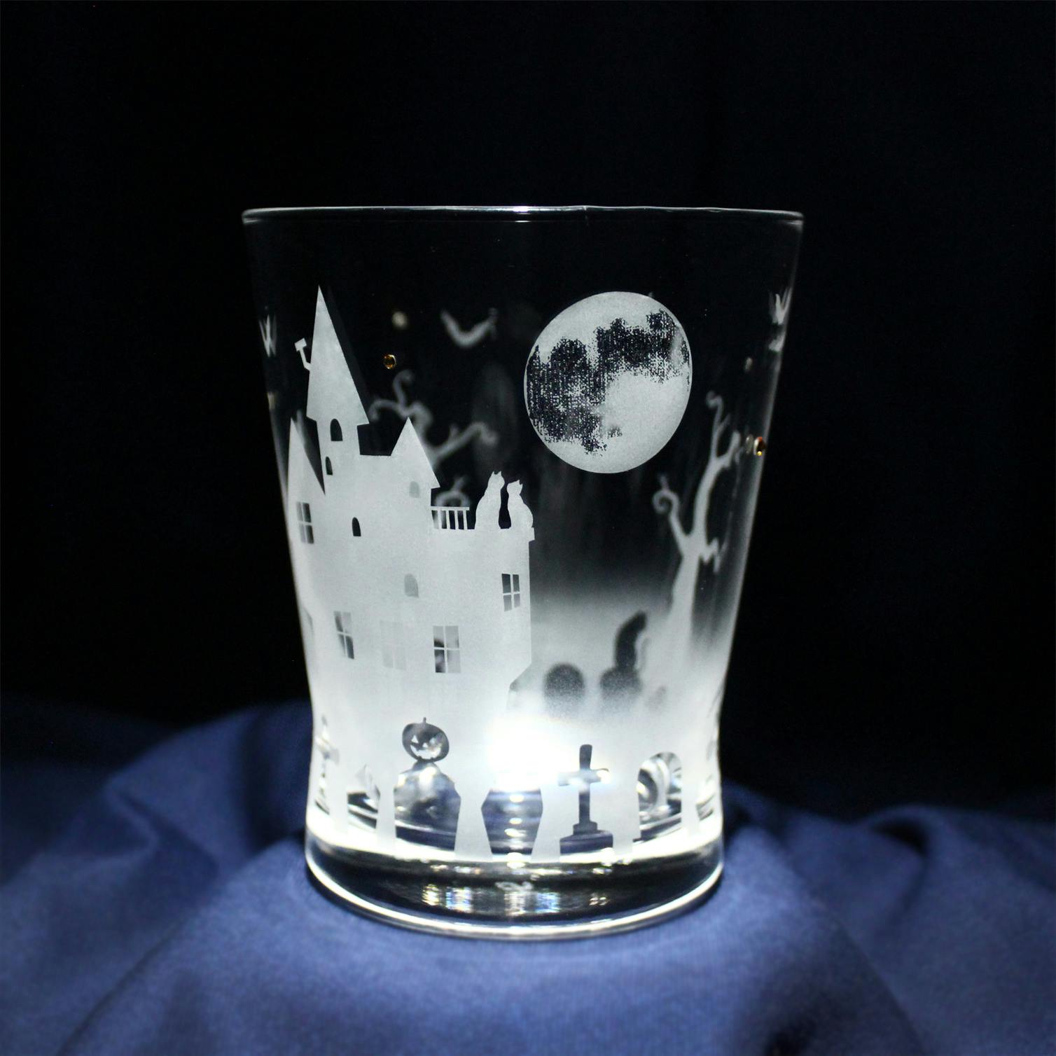 ティアドロップ形状のワイングラスに、ハロウィンのモチーフ達をサンドブラストで彫刻して、妖しげな雰囲気のハロウィン・ワイングラスができました!