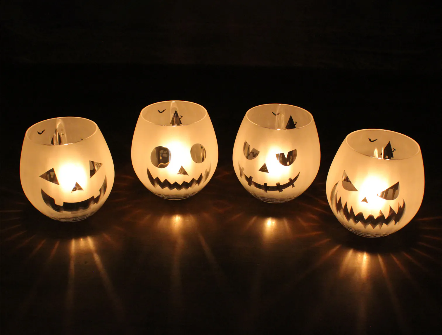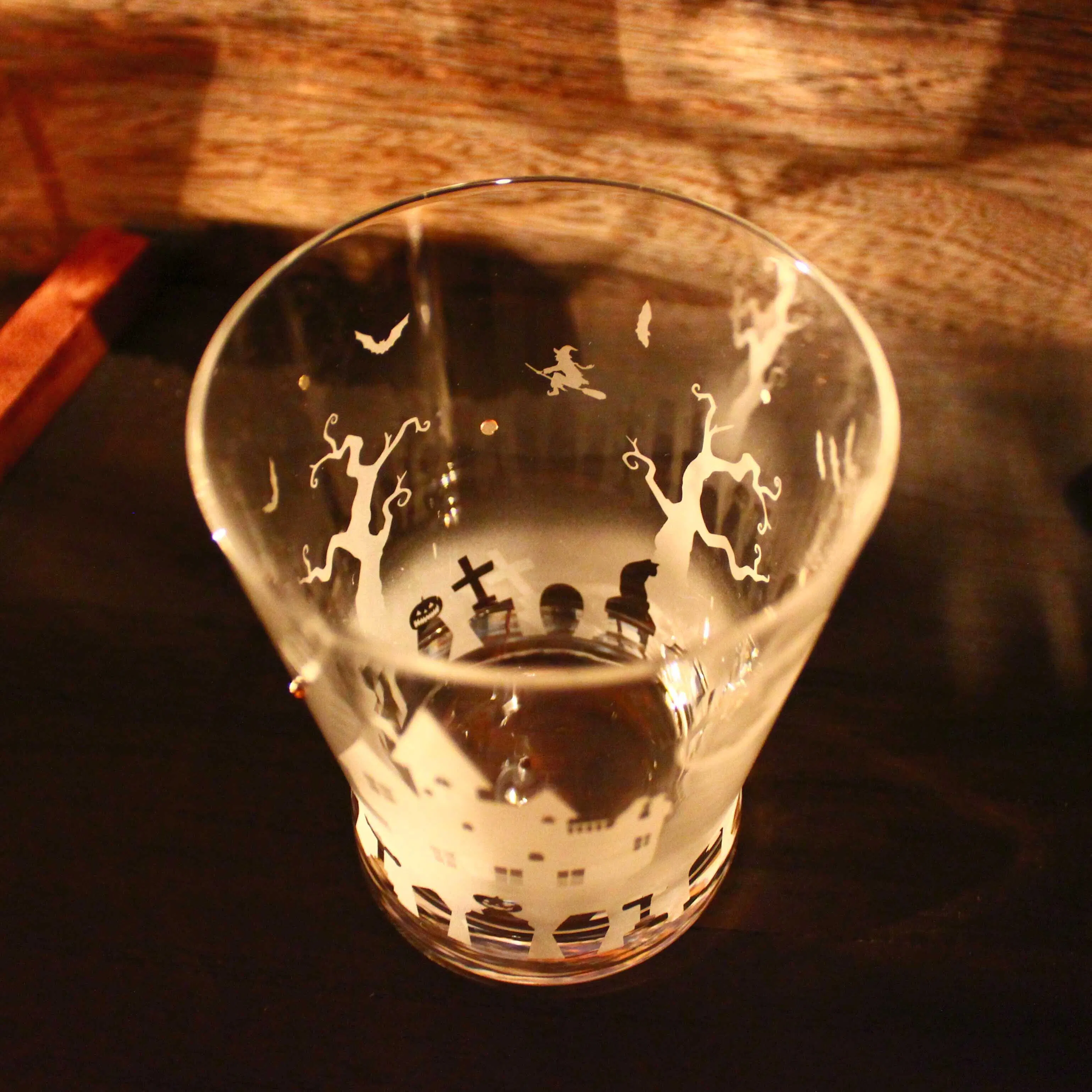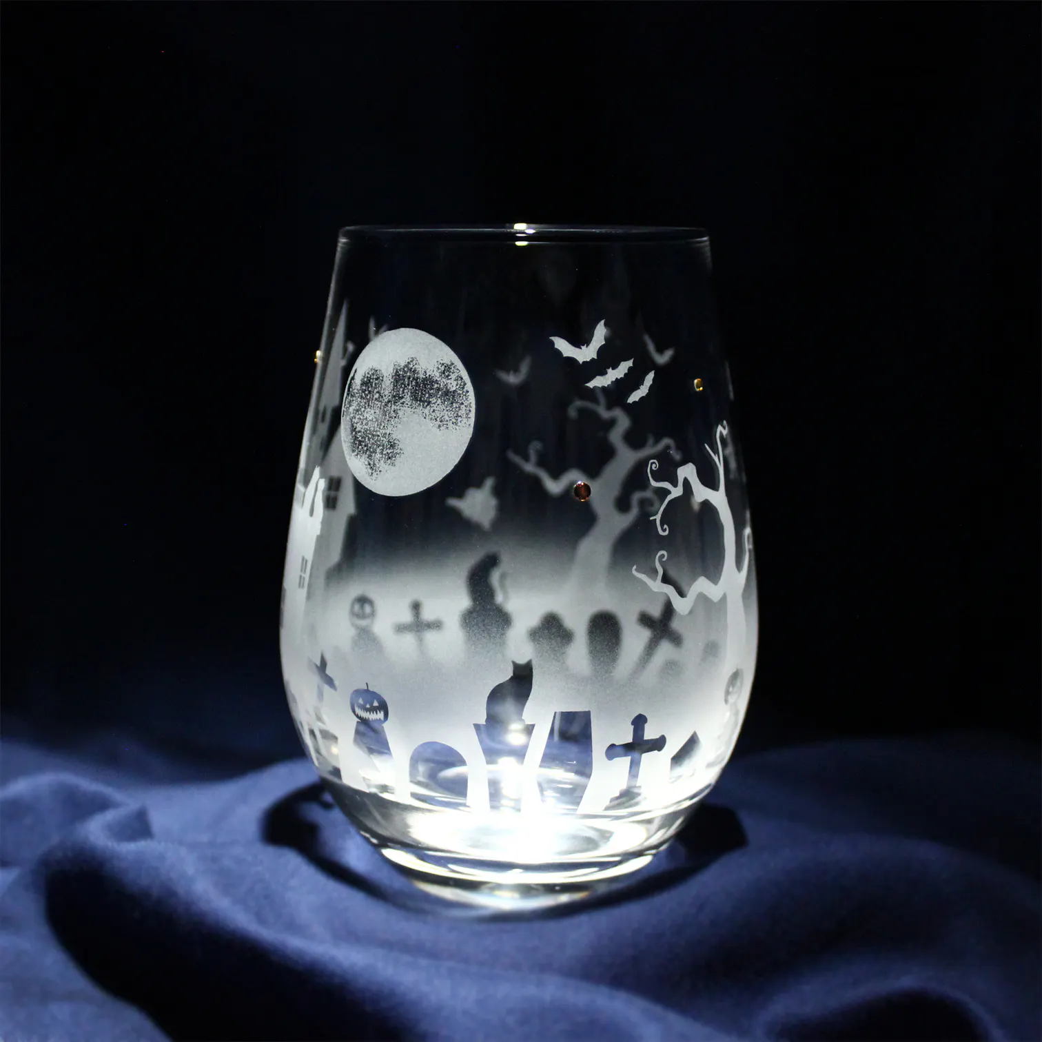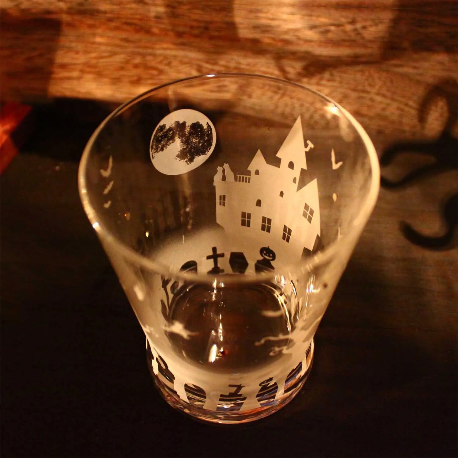 ティアドロップ形状のワイングラスに、ハロウィンのモチーフ達をサンドブラストで彫刻して、妖しげな雰囲気のハロウィン・ワイングラスができました!