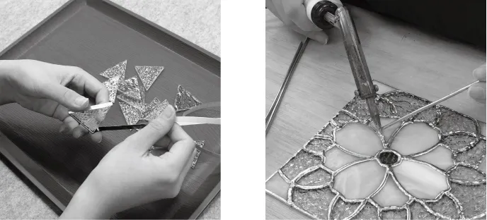 一方「ティファニー技法」はケイム技法より細かい表現ができるので、ランプなどの細かい表現が必要な作品に適している技法です。ガラスのまわりに銅のテープを巻いて、その上をハンダ付けで溶接していく技法で、アメリカで開発されました。