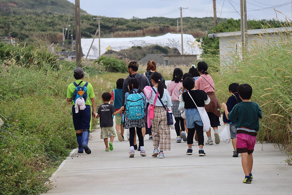 こんにちは!師走にはいりまして一気に冬モードの宝島です。といっても15度ほどの気温ですが、、、12月に入り巨大宝島壁画もいよいよ大詰め、素晴らしい作品ができあがりつつあります。ここ10日間で岩切章吾さんと、ロコサトシさんそれぞれのワークショップが行われました!今日は岩切さんのワークショップのご紹介です。天候がすぐれなかったり、島の行事等でなかなかワークショップの日程が決まらない中、岩切さんとスタッフは毎日天気図と空をながめながらワークショップをできる日を話し合い、ここだっ!というタイミングをみつけ急遽ワークショップが決定しました。ワークショップ前日にはモーチーフの場所を決定するため岩切さんは夜中まで作業したり、スタッフは時間が夜になることが予想されるため大型電灯の準備をしたり。↑このように事前に参加者の描くスペースの目印を岩切さんが沢山作ってくれています!大小さまざまな大きさをチョークでマークしてくれています。↑この大型電灯があれば夜でも作業可能です!連日この電灯を使用して岩切さんは夜遅くまで作業してくれています!ワークショップ当日は平日夕方からにもかかわらず沢山の方がワークショップに参加してくださり思い思いの宝島を壁画に残してくれました!言葉で伝えるより、下の写真から伝わるのではと思いますので是非ご覧ください♪ママ、何描いてるの~?親子で記念に描こう♪私、僕が大きくなっても♪宝島へ訪れるみなさんへ♪それぞれのメンバーが沢山の想いを壁画にのせました★今回参加してくださった皆の想いと岩切さんのコラボレーションの完成が楽しみです。最後にこの壁画に魂をいれようと岩切さんはまだまだアイディアがあるようなのでまたご紹介しますね!岩切さん毎晩夜遅くまで作業、ありがとうございます!!WSに参加してくださった皆さん、ありがとうございます!!次回はロコサトシさんのワークショップのご紹介します★