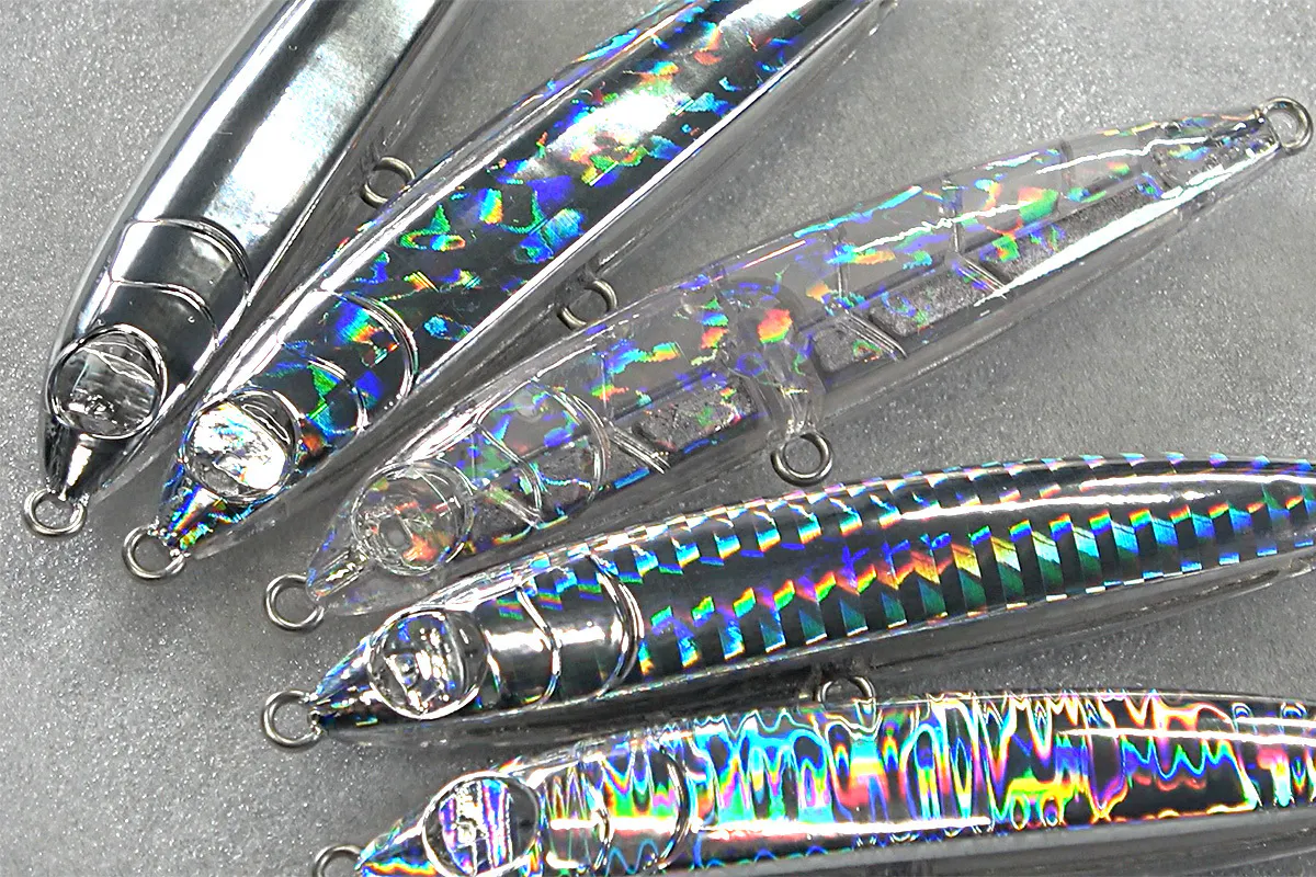 国産のホログラム紙をルアーに転写します。ルアーのカラーによってホログラムの柄を選定し、バリエーション豊かにします。