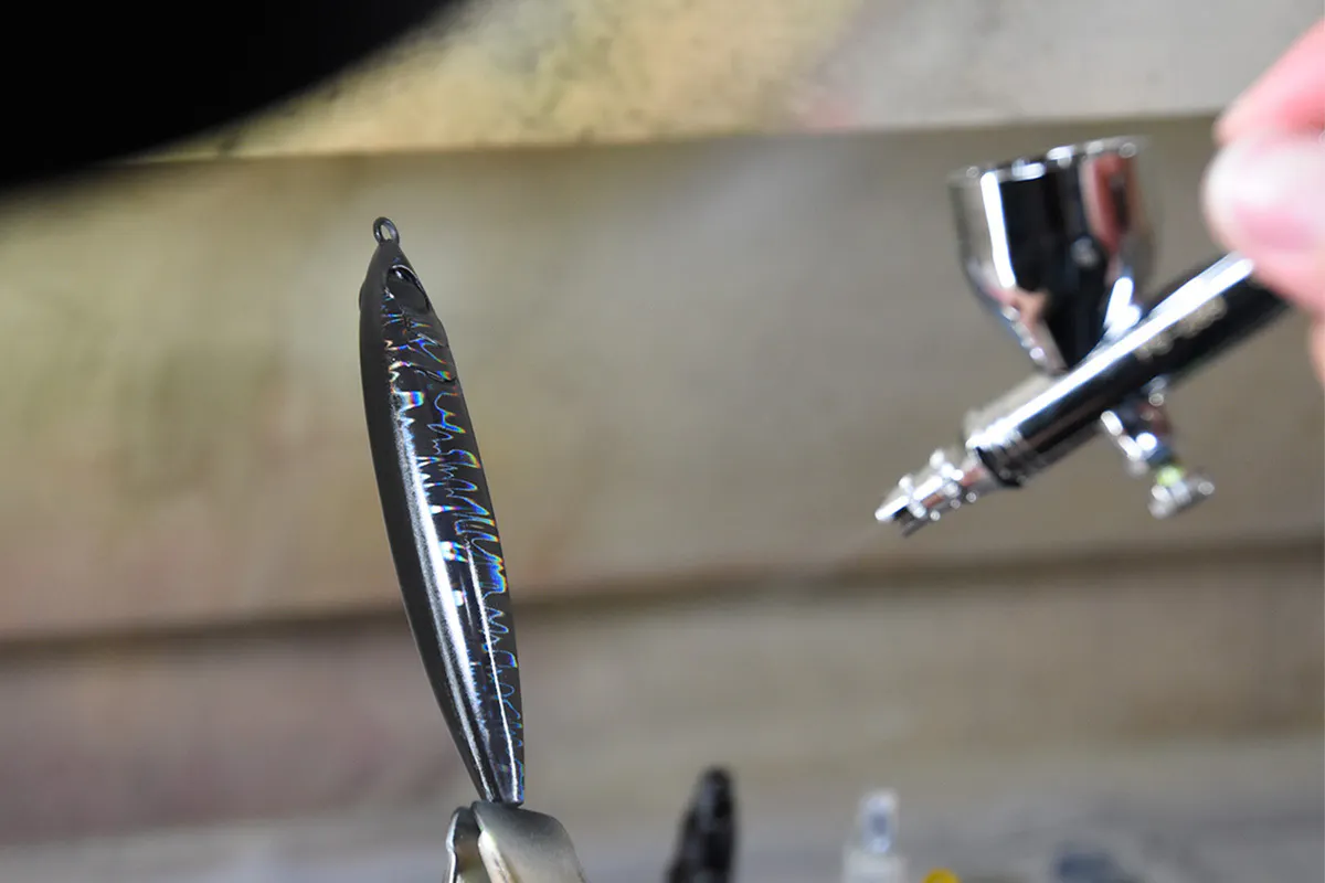 自社工場にて1つ1つ塗装を施します。仕上げに2液性のウレタンでコーティングしルアーが完成します。