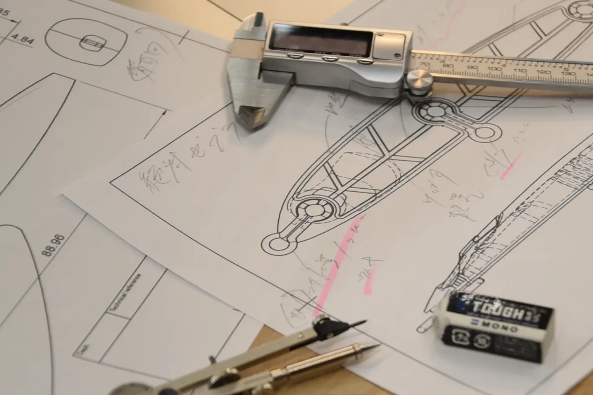 フリーハンドでルアーの形やエラの模様を頭の中のイメージ通りに書き出します。エラの凹凸やエイト環の溝、ルアーの厚みなども詳細に書き出します。