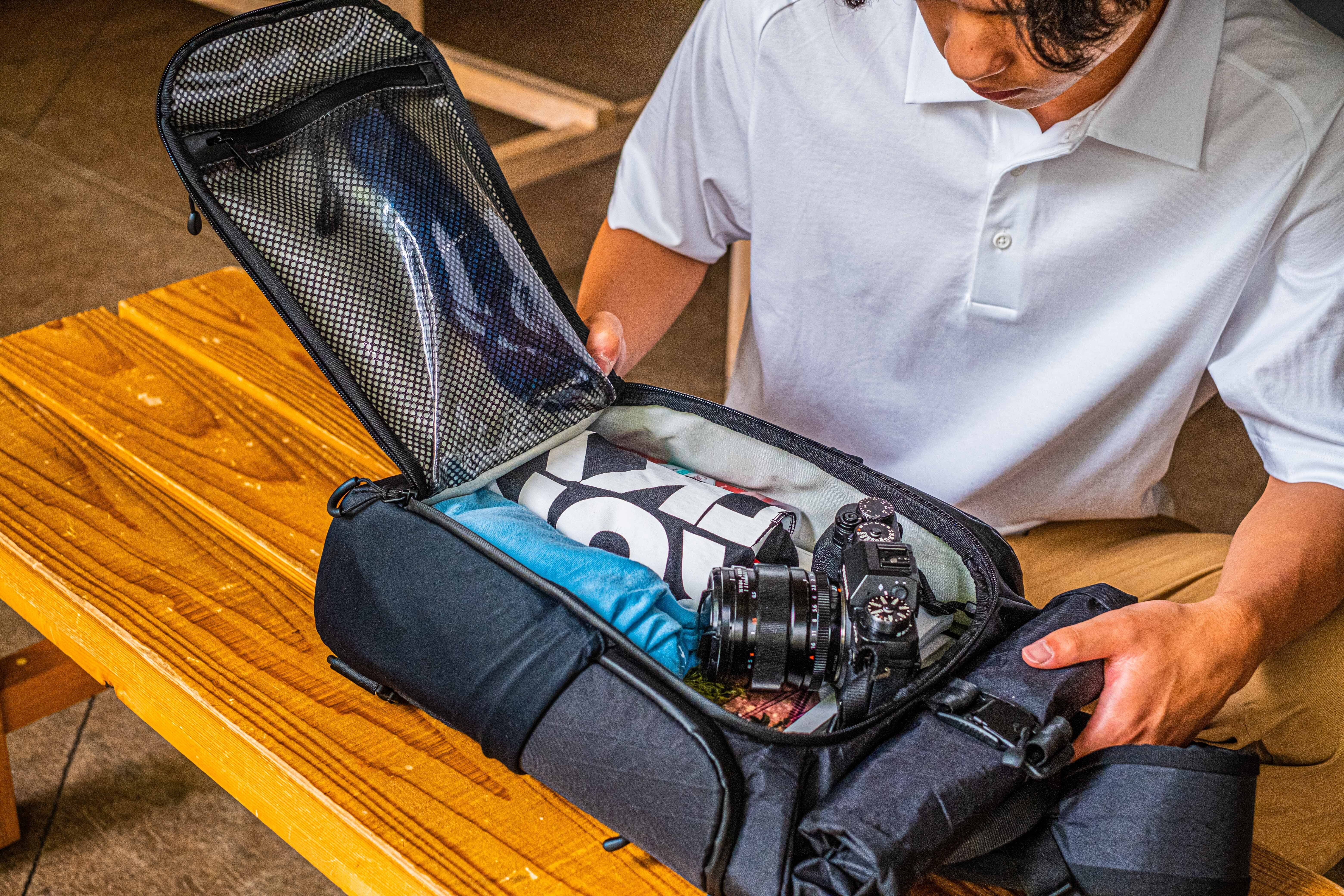 1つは、先ほどご紹介したロールトップから。すぐに取り出したいものは、こちらから収納しておくと便利です。また、雨天でも内部が濡れにくい点もメリットとして挙げられます。