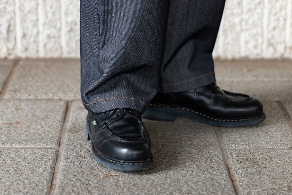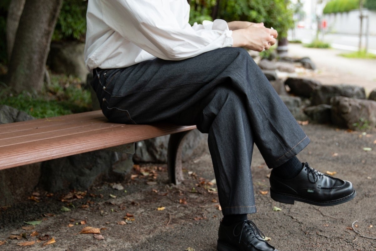 見た目はかなり本格的なデニムですが、ウールと美濃和紙で仕立てたこのパンツであ