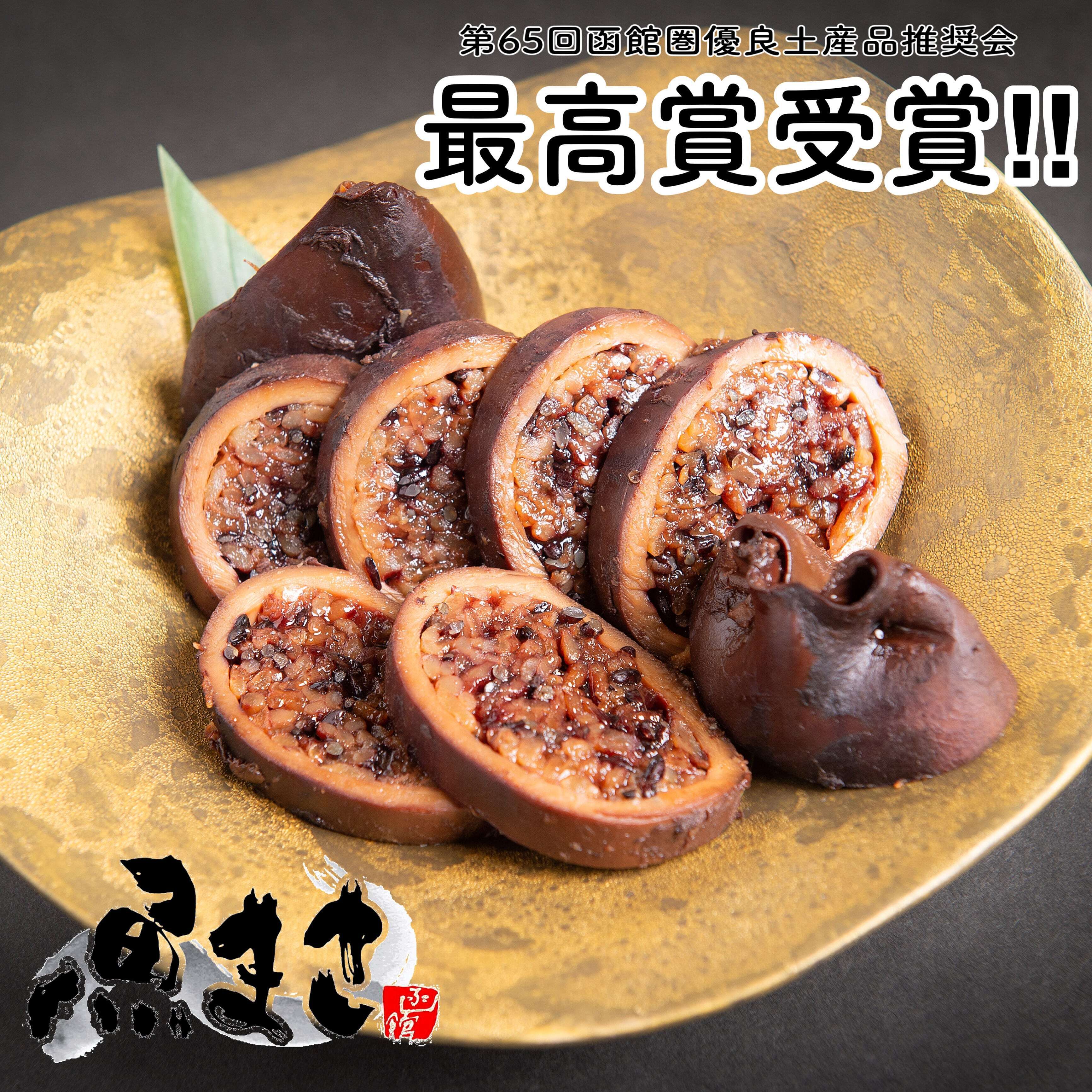 北海道の福島町で生産されている古代米の1種、「黒米」を使用した自家製いかめしです!一般的に量産されているいかめしとは一味違う、地物にこだわる当店ならではの逸品。