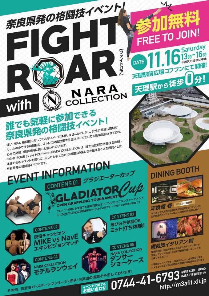 格闘技で奈良県を元気にしたい、地域を活性化さえたいという思いから奈良県天理市駅前のコフフンにて、日本では初めての試みとなる賞金グラップリングトーナメントGLADIATOR CUPを主催。