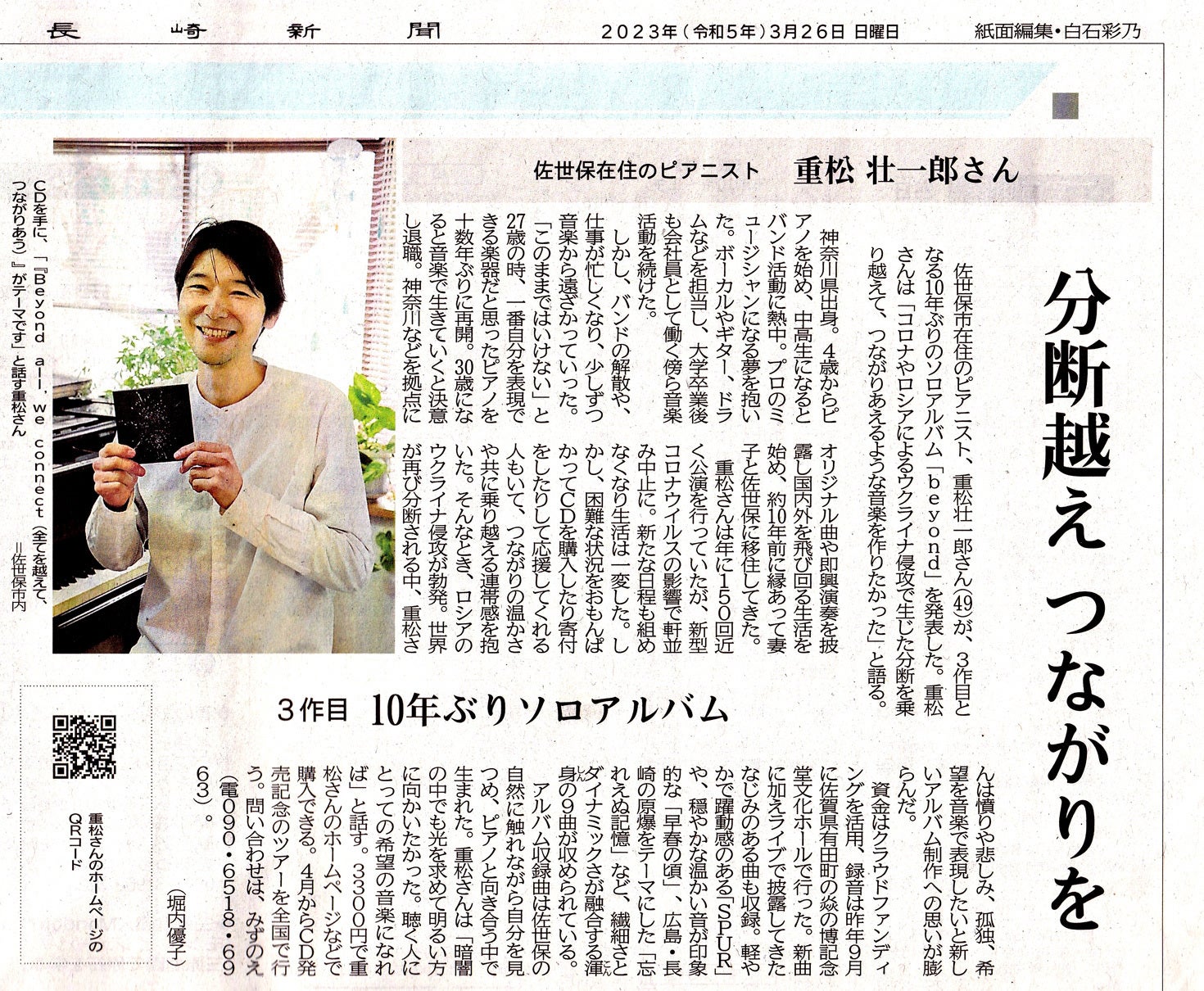 2023年3月26日付けの長崎新聞に、重松壮一郎の記事が掲載されました。