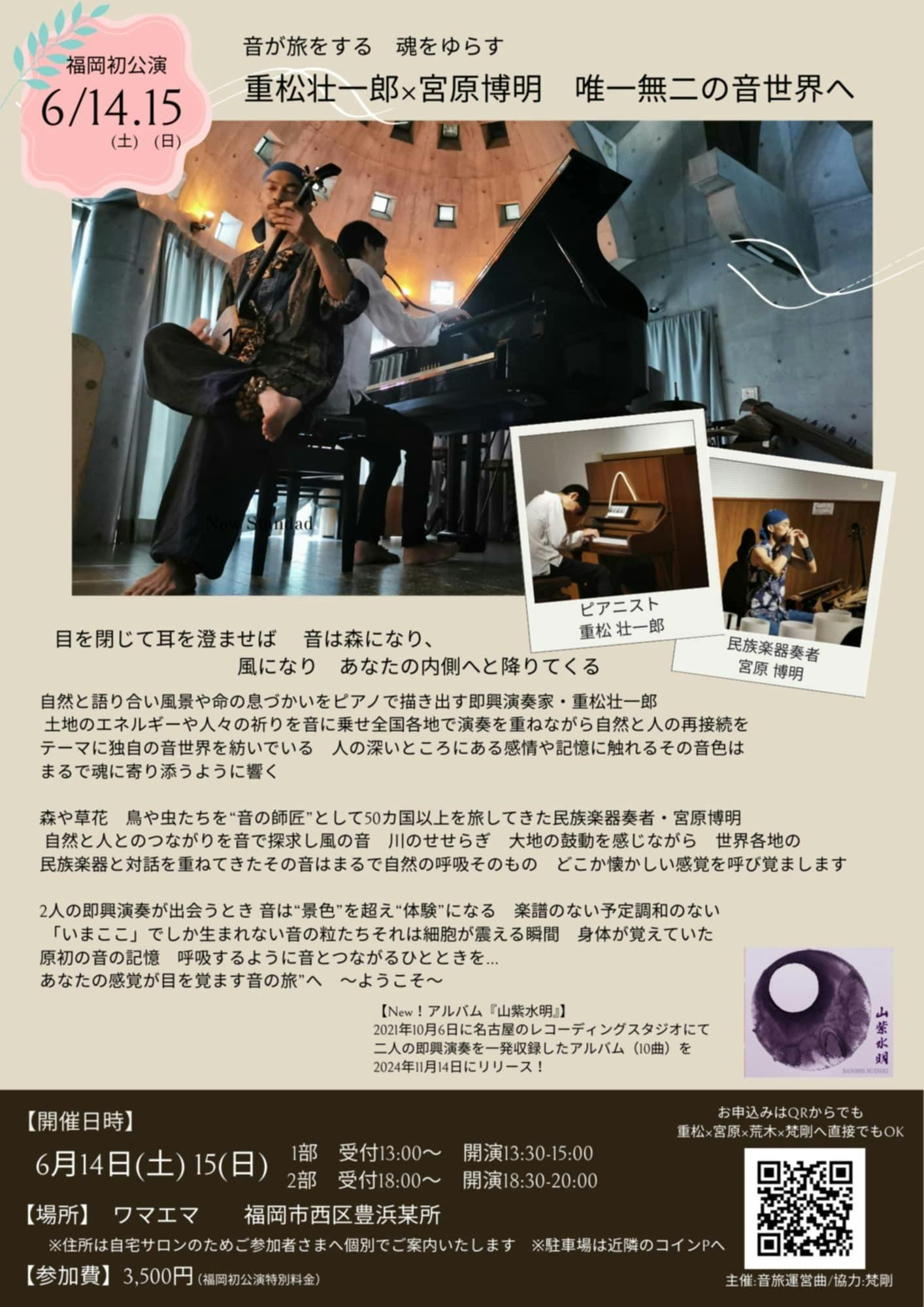 昨年、アルバム『山紫水明』をともにリリースした民族楽器奏者・宮原博明とのライブ。福岡では初開催です。
