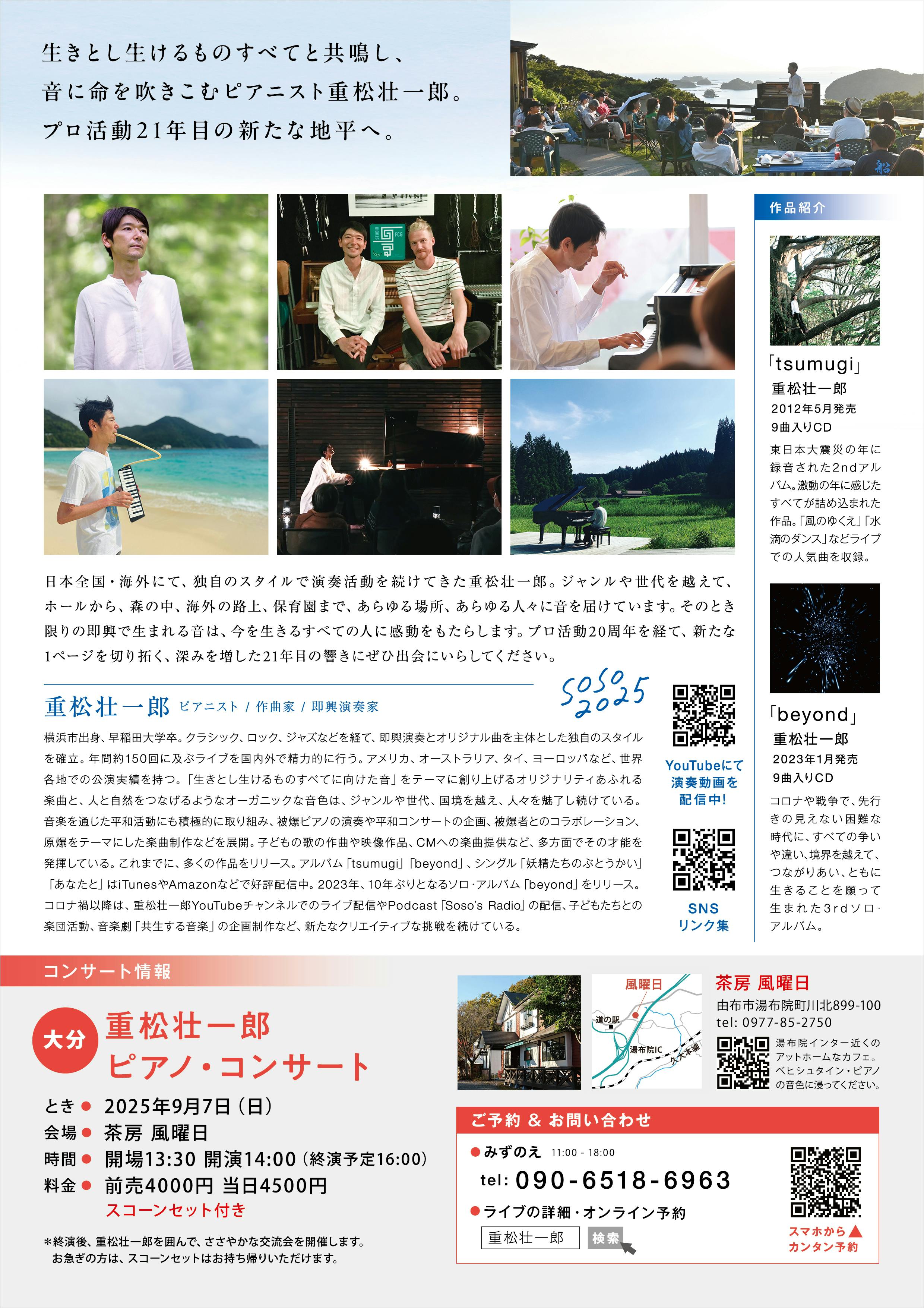 横浜市出身、早稲田大学卒。クラシック、ロック、ジャズなどを経て、即興演奏とオリジナル曲を主体とした独自のスタイルを確立。年間約150回に及ぶライブを国内外で精力的に行う。アメリカ、オーストラリア、タイ、ヨーロッパなど、世界各地での公演実績を持つ。「生きとし生けるものすべてに向けた音」をテーマに創り上げるオリジナリティあふれる楽曲と、人と自然をつなげるようなオーガニックな音色は、ジャンルや世代、国境を越え、人々を魅了し続けている。また、音楽を通じた平和活動にも積極的に取り組み、被爆ピアノの演奏や平和コンサートの企画、被爆者とのコラボレーション、原爆をテーマにした楽曲制作などを展開。さらに、子どもの歌の作曲や映像作品、CMへの楽曲提供など、多方面でその才能を発揮している。これまでに、多くの作品をリリース。アルバム「tsumugi」「beyond」、シングル「あなたと」「ふれる」はiTunesやAmazonなどで好評配信中。2023年には、10年ぶりとなるソロ・アルバム「beyond」をリリースした。コロナ禍以降は、重松壮一郎YouTubeチャンネルでのライブ配信やPodcast「Soso’s Radio」の配信、子どもたちとの楽団活動、音楽劇「共生する音楽」の企画制作など、新たなクリエイティブな挑戦を続けている。