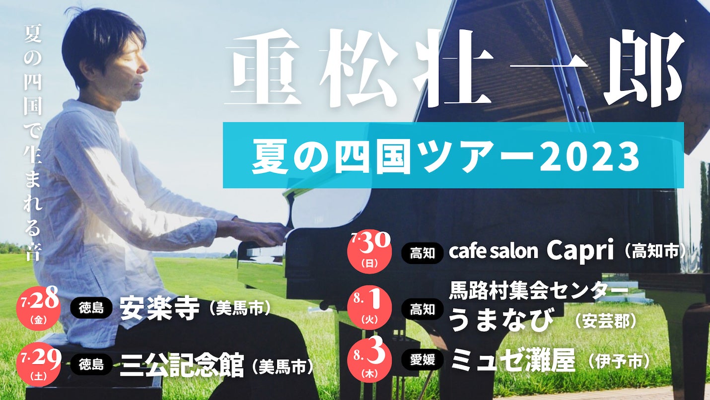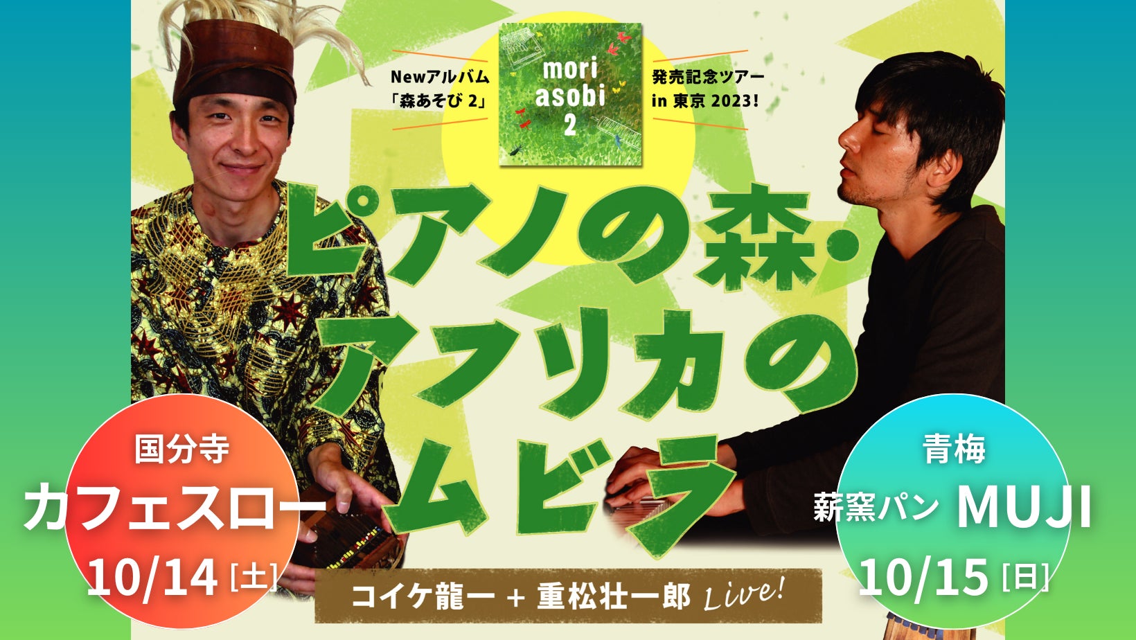 こんにちは!ピアニストの重松壮一郎です。10月14日(土)15日の2日間、東京にてライブを行います。ようやく過ごしやすくなった秋の日の、気持ちいいライブにいたします。ぜひともお越しください。お待ちいたしております! ━━━━━━━━━━━━━━━━━━━コイケ龍一 + 重松壮一郎「森あそび 2」発売記念ツアー━━━━━━━━━━━━━━━━━━━アフリカの優しい音色を響かせるムビラ奏者「コイケ龍一」と、全てのいのちとの共鳴を音に紡ぐピアニスト「重松壮一郎」。コロナ禍の2022年に発表した13年ぶりの共演アルバム「森あそび 2」の、ちょっと遅れの発売記念ライブを開催!アフリカ楽器「親指ピアノ」(ムビラ、イリンバ、チリンバ等)と西洋の楽器ピアノの珍しいセッション。唯一無二の森あそびサウンド。森の精霊のようにキラキラと宙に舞う、音の1つぶ1つぶを、ぜひ体感しに来てください!【ツアー・スケジュール】10/14(土)東京 | カフェスロー(国分寺市)10/15(日)東京 | 麦 MUJI(青梅市)───────────────ピアノの森 アフリカのムビラコイケ龍一 + 重松壮一郎〜キャンドルナイト・ライブ───────────────◯とき: 2023年10月14日(土)◯会場: カフェスロー(東京都国分寺市)◯時間: 開場18:30 開演19:00◯料金: 大人 前売3000円 当日3500円 / 小中学生 前売1500円 当日2000円 / 幼児無料 + 1ドリンク・オーダー◯出演: 重松壮一郎(ピアノ、鍵盤ハーモニカ)、コイケ龍一(親指ピアノ、歌、パーカッション)キャンドルの輝く幻想的な空間に、美しいハーモニーが響く、特別な空間。素材にこだわったおいしいお食事やスイーツもご用意します!*お食事を召し上がる方は10/11(水)までにご予約ください。【ライブの詳細 & オンライン予約】http://www.livingthings.org/schedule/231014_cafeslow/───────────────ピアノの森 アフリカのムビラコイケ龍一 + 重松壮一郎〜青梅の森の音楽会───────────────◯とき: 2023年10月15日(日)◯会場: 薪窯パン&ケーキ 麦<muji>(東京都青梅市)◯時間: 開場14:00 開演15:00◯料金: 大人2500円 小中学生1000円(当日500円増し)◯出演: 重松壮一郎(ピアノ、鍵盤ハーモニカ)、コイケ龍一(親指ピアノ、歌、パーカッション)青梅の自然と調和するナチュラルな音色が、山に響き渡るライブ。石薪窯で焼いた素朴でおいしいパンや、ケーキとともにどうぞ!子どもも大歓迎です。ぜひ親子でもお越しください。【ライブの詳細 & オンライン予約】http://www.livingthings.org/schedule/231015_muji/
