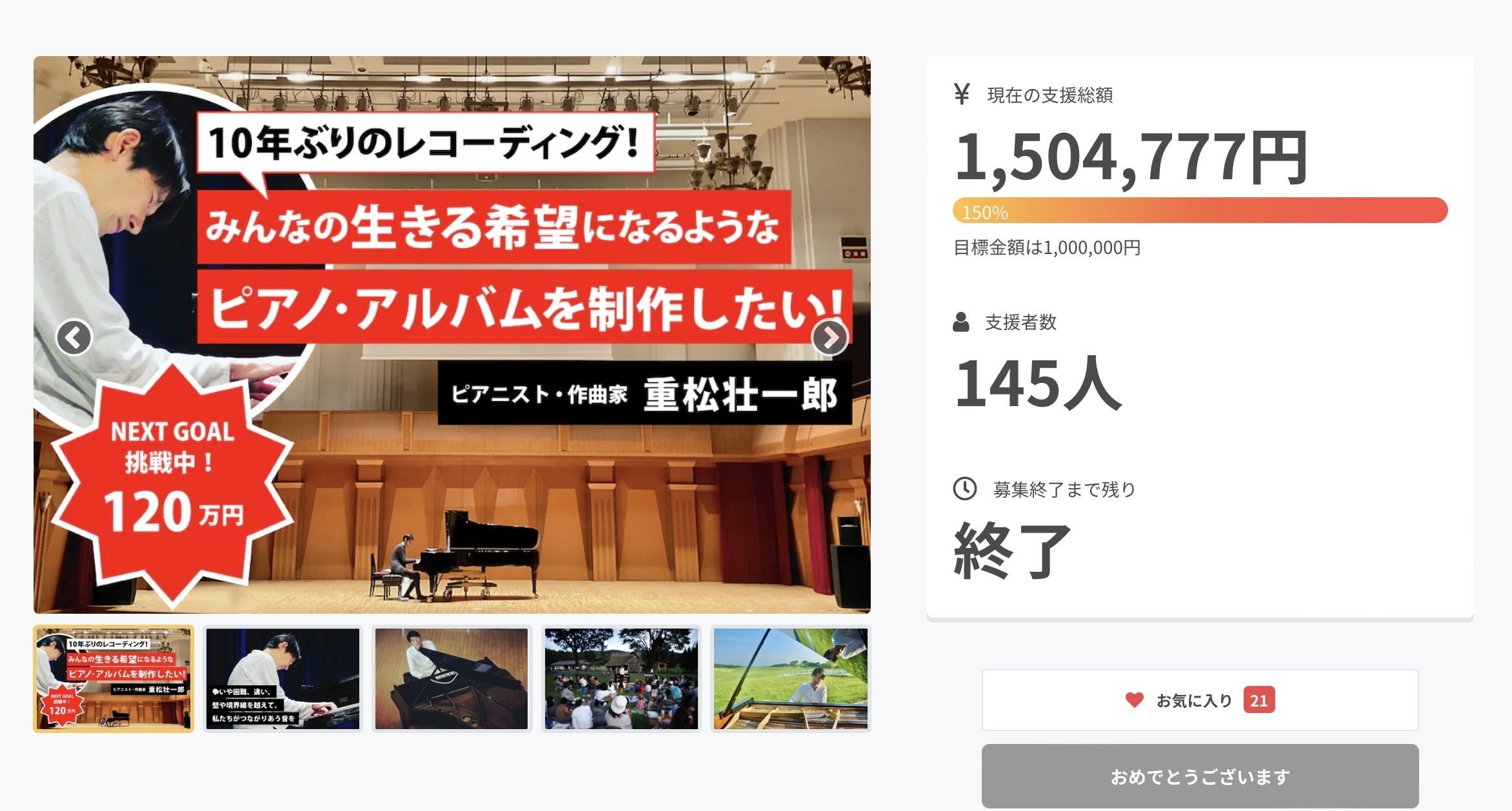 7月17日付でスタートした、ピアニストの重松壮一郎の「10年ぶりのNewアルバム制作プロジェクト」のクラウドファンディング。9月2日23:59を持ちまして、募集が終了しました。無事にプロジェクトの目標金額を達成しましたので、ご報告させていただきます。支援総額:1,504,777円支援者総数:145人* 詳細はこちらからご覧いただけますhttps://camp-fire.jp/projects/view/608805皆様のご支援、ご協力によりプロジェクトが成功しましたこと、心より感謝申し上げます。 ■今後の流れについて9/20〜22の3日間にレコーディングを行います。その後、音源編集やジャケット制作などを経て、来年の1月にCDが完成する予定です。支援者の皆様へリターン発送は、CD完成後になりますので、来年の1月以降になります。少し先になってしまい大変申し訳ないのですが、お待ちください。レコーディングの様子など、今後もプロジェクトページの「活動報告」、重松壮一郎WebサイトのBlog「日々のレポート」に掲載します。ぜひ時々のぞいてみてください。今後とも、重松壮一郎をどうぞよろしくお願いいたします!.............................◎Webサイトhttp://www.livingthings.org◎ライブ・スケジュールhttp://www.livingthings.org/schedule/◎重松壮一郎ニュースレター(月1回発行)http://www.livingthings.org/letter/◎YouTubeチャンネルhttps://www.youtube.com/sosopiano