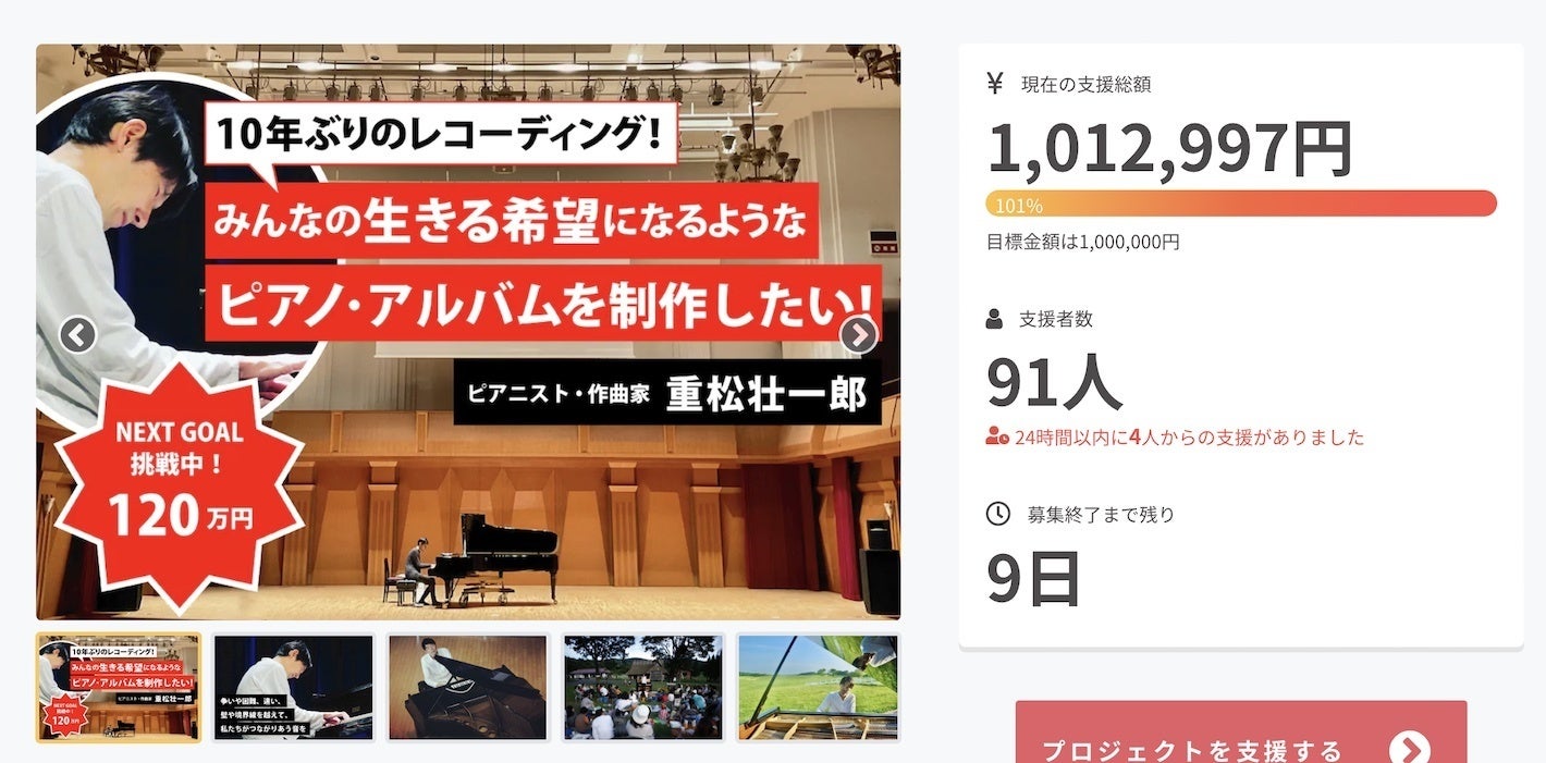7月17日付でスタートした「10年ぶりのNewアルバム制作プロジェクト」のクラウドファンディング。残り9日。一桁台になり、今日は朝からどきどきしていました。しかし、本日、目標額100万円に達しました。ご支援くださった皆さん、応援してくださった皆さん、ありがとうございます! ★ネクスト・ゴールに挑戦!ネクスト・ゴール120万円に、引き続き挑戦します。達成のあかつきには、全てのご支援者のリターンに、特製ポストカードを追加します。ぜひ情報のシェアにご協力ください。よろしくお願いいたします!◎クラウドファンディングのページhttps://camp-fire.jp/projects/view/608805