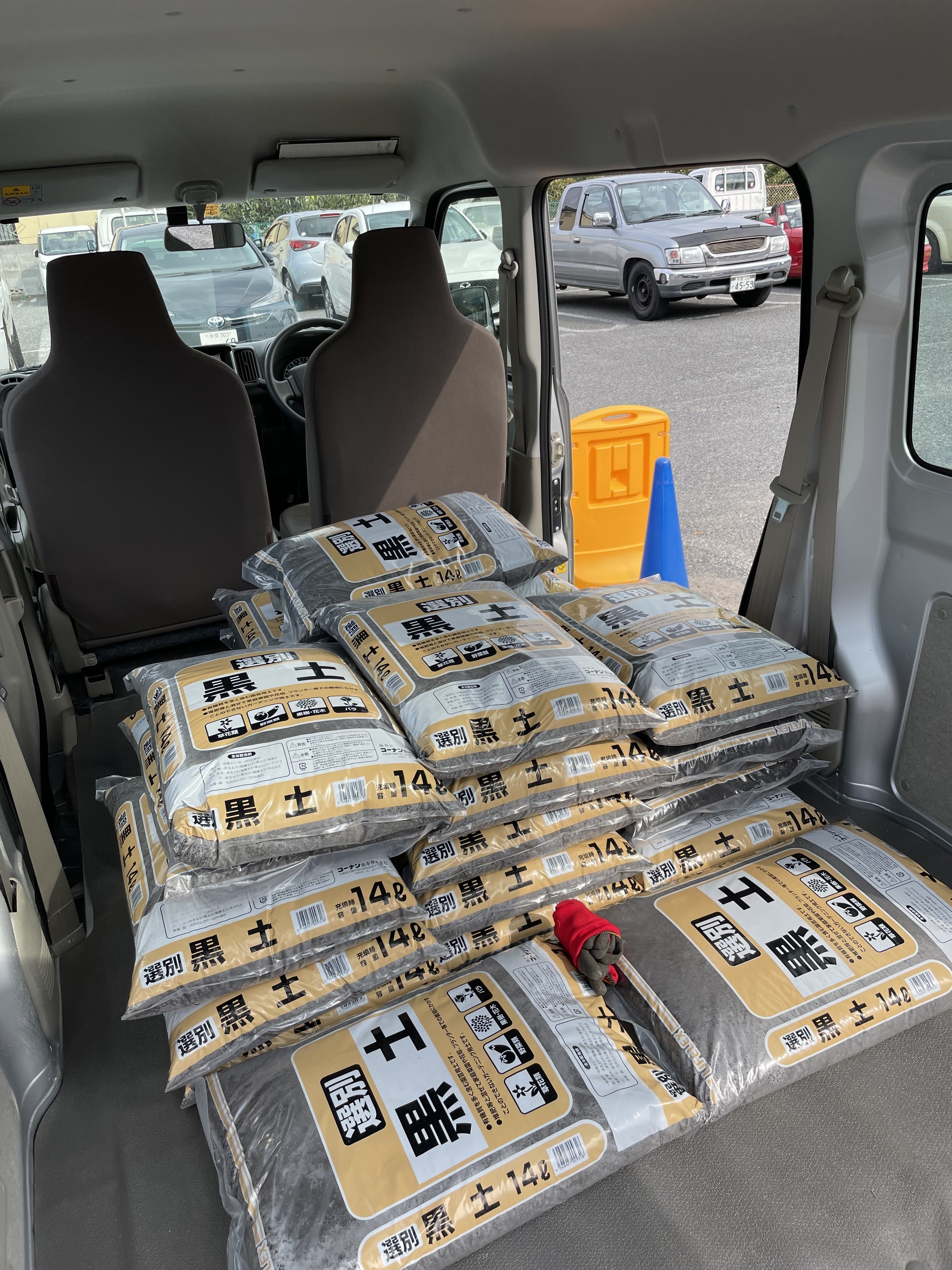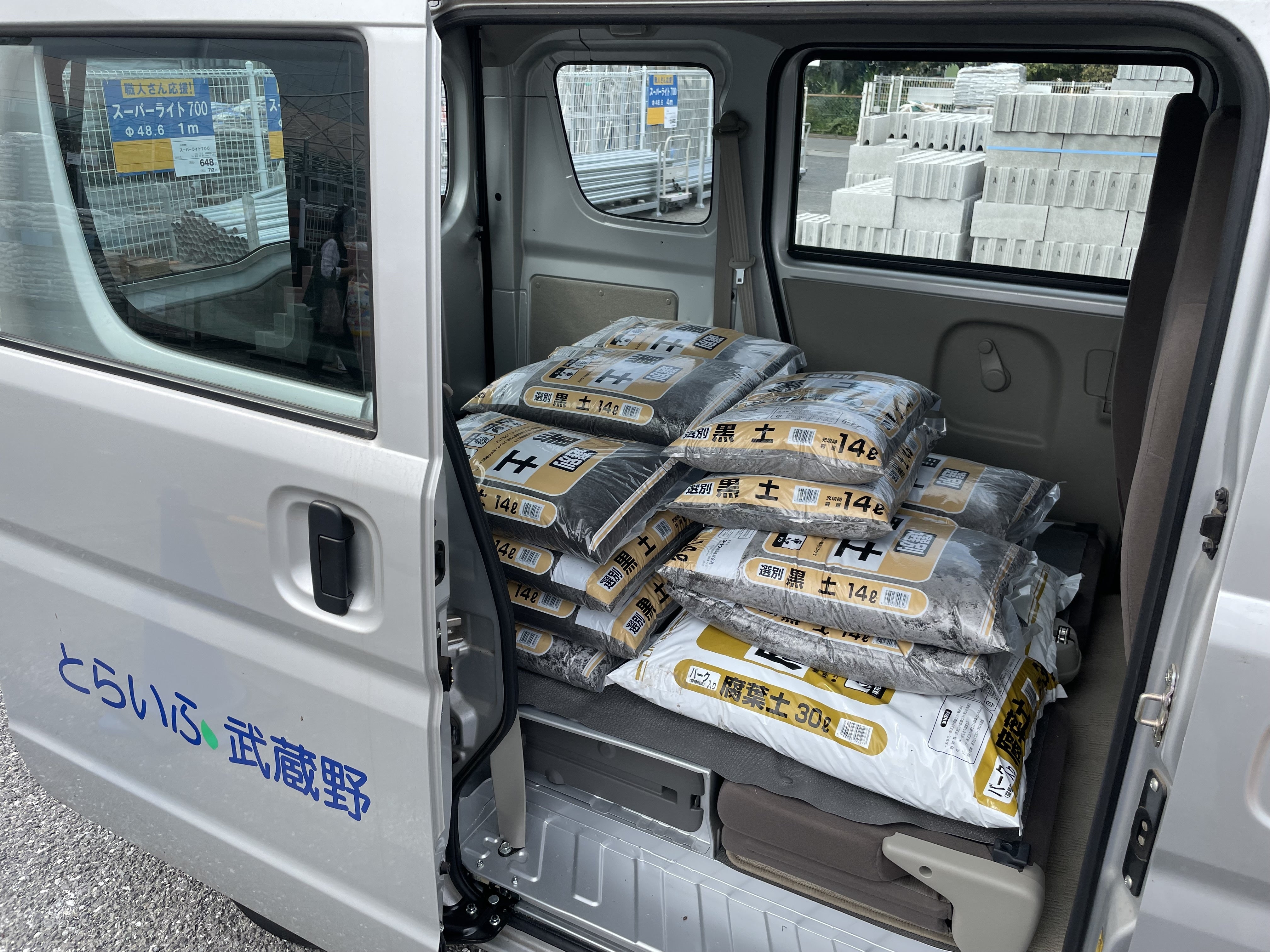 ▲施設から車で15分ほどのところにあるホームセンターで、プランター2基分の土(黒土(14ℓ)22袋と、腐葉土(30ℓ)2袋)を購入しました。合計金額は7,188円でした。皆様にご支援をいただいたお金で、こうして土を買うことができました。どうもありがとうございます!