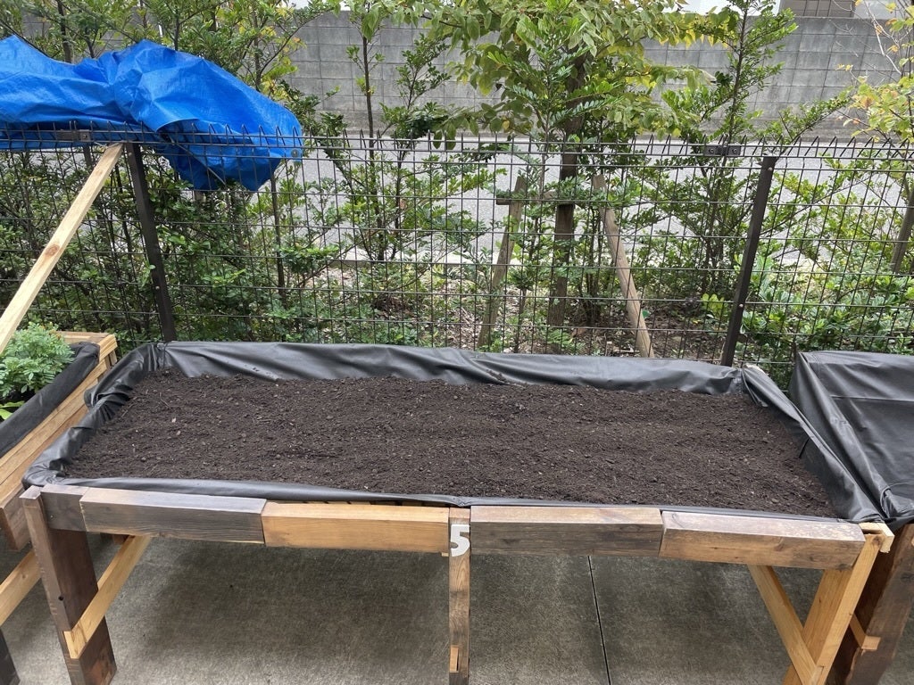 実を言うと、この「土入れ」の作業は、プランターを製作した私にとって緊張の瞬間です。なぜなら、廃材でつくったツギハギのプランターですので、(とても愛着がありますが)土入れの最中に脚部が折れて、倒壊してしまう可能性がゼロではありません。。自分が恥をかくだけならまだしも、作業をする人が怪我でもしたら大変です。ひとりでも多くの方々に関わっていただきたい とらいふぁーむ の活動ですが、この土入れの作業ばかりは、一人でこっそりとやりたい行程でもあります(内緒です)。