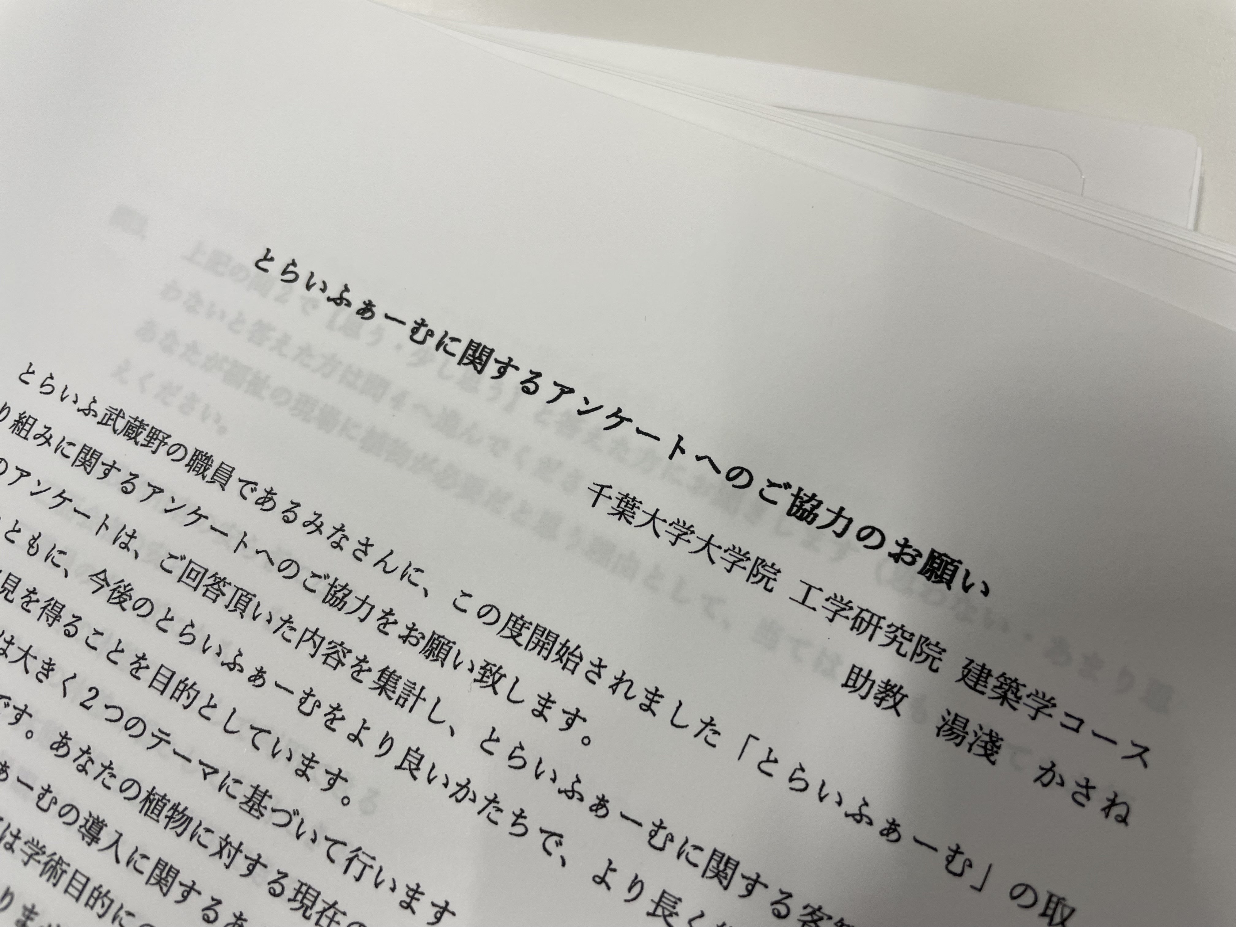 前々回の活動報告のなかでもお伝えしました、千葉大学大学院の湯淺先生による質問紙調査を開始しました。現場で実働する職員たちが、とらいふぁーむのことをどのように考えているかといった内容のアンケートを行ってます。