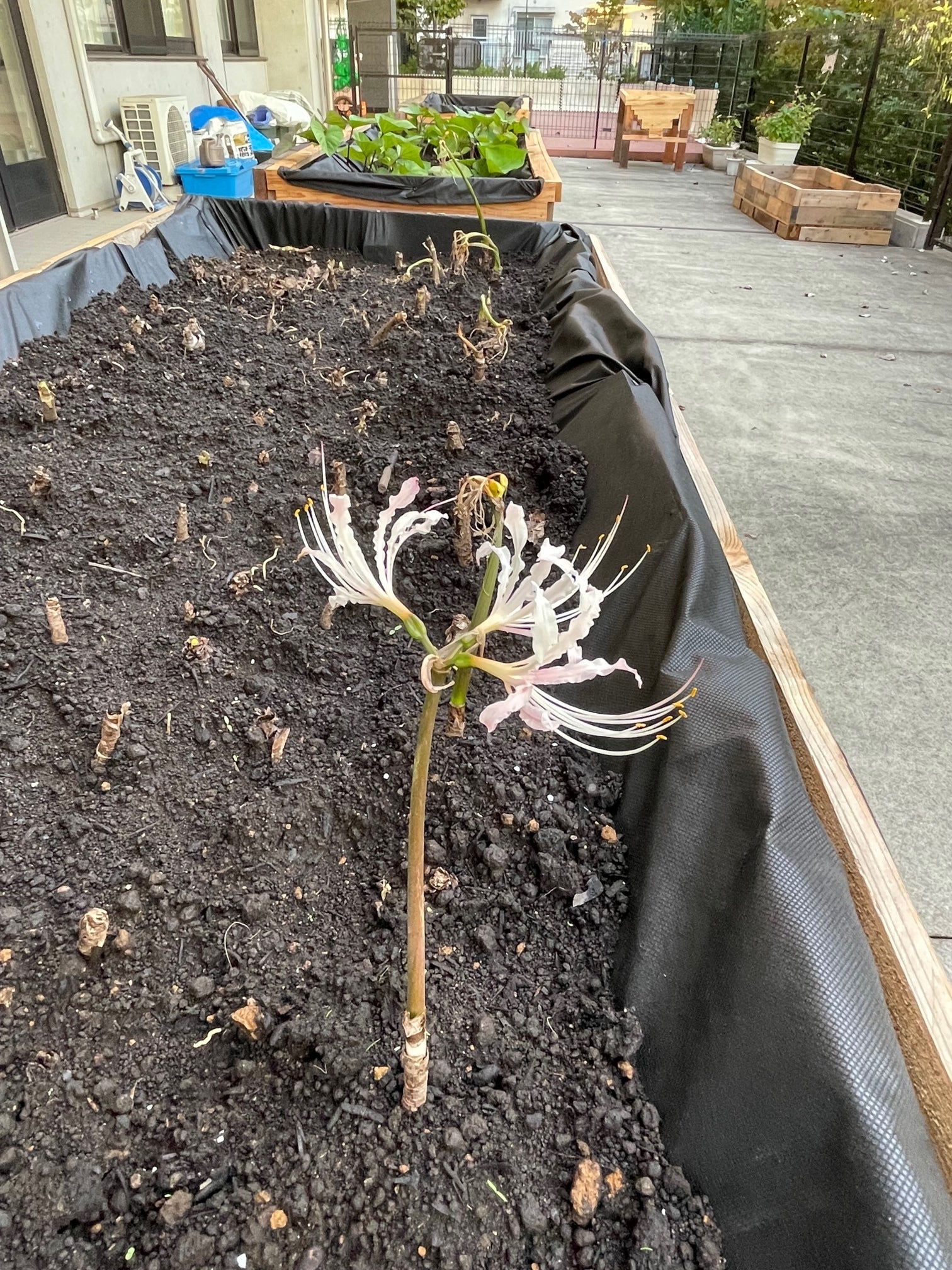 ▲白い曼殊沙華です。近所に住む方からおすそ分けを頂いたのものです。私たちは植える時期を間違えたようで、多量の球根が土中に眠ってたままです。「これの楽しみは来年にとっておきなさい」と、T様(クリーンむさしの)に慰めていただいています。そんな中、季節を間違えたのか、一本だけ健気に開花してくれています。(その奥に映るのは、さつまいもです。)