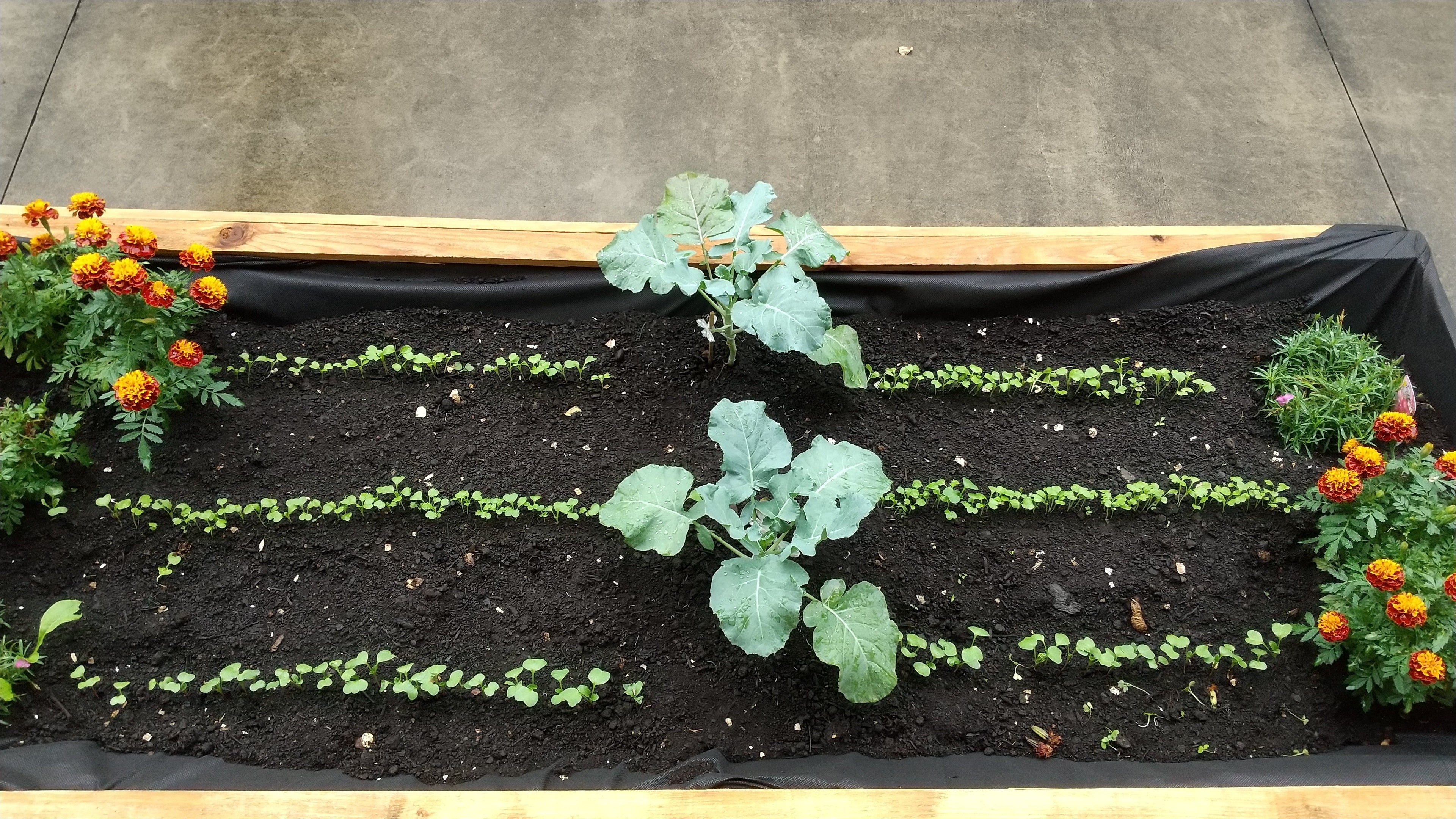 手前から、はつか大根・小かぶ・小松菜が並び、中央の2つはブロッコリーです。