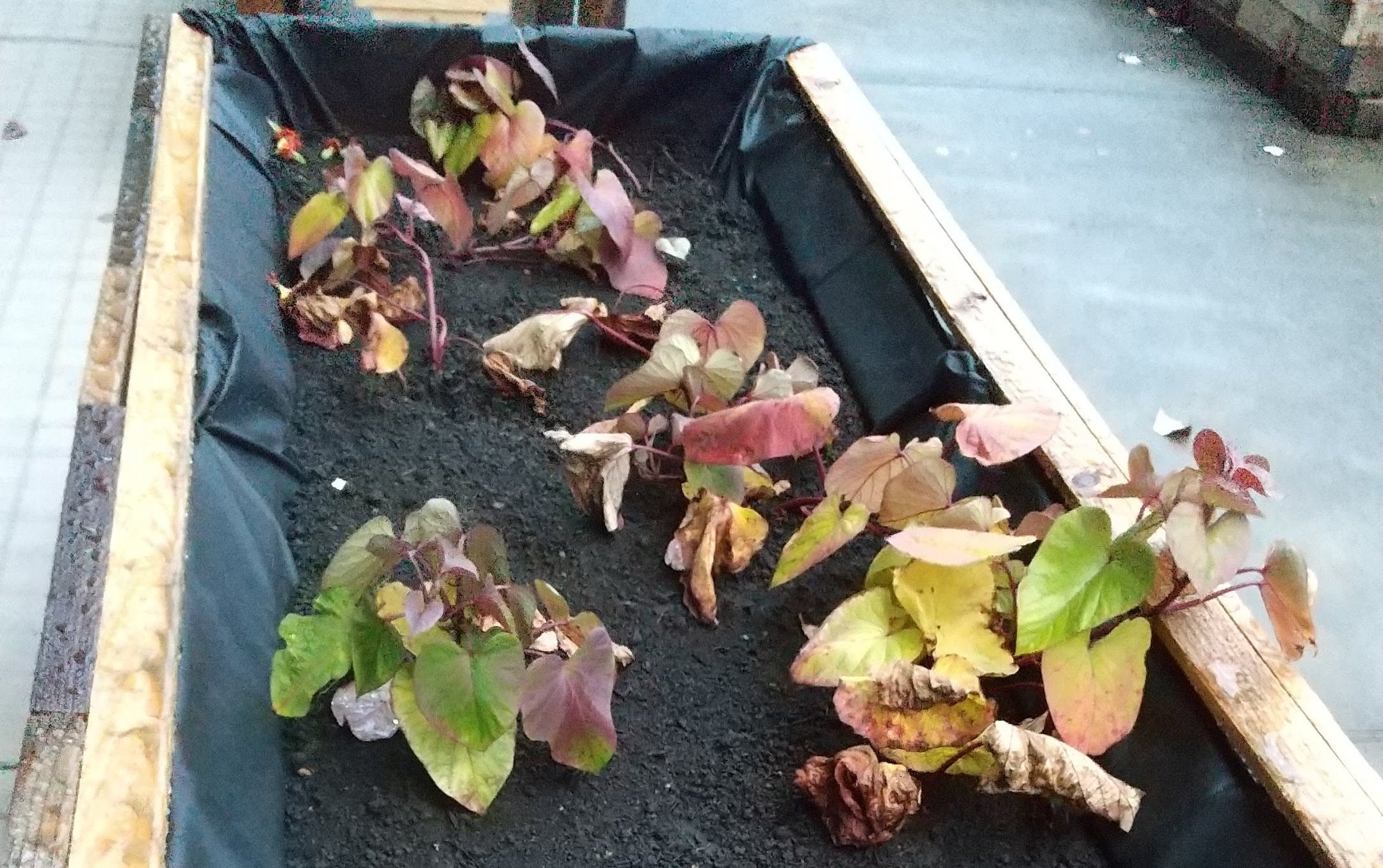 (植付け時期が遅かったようで、その後抜いたところ芋は付いていませんでした)