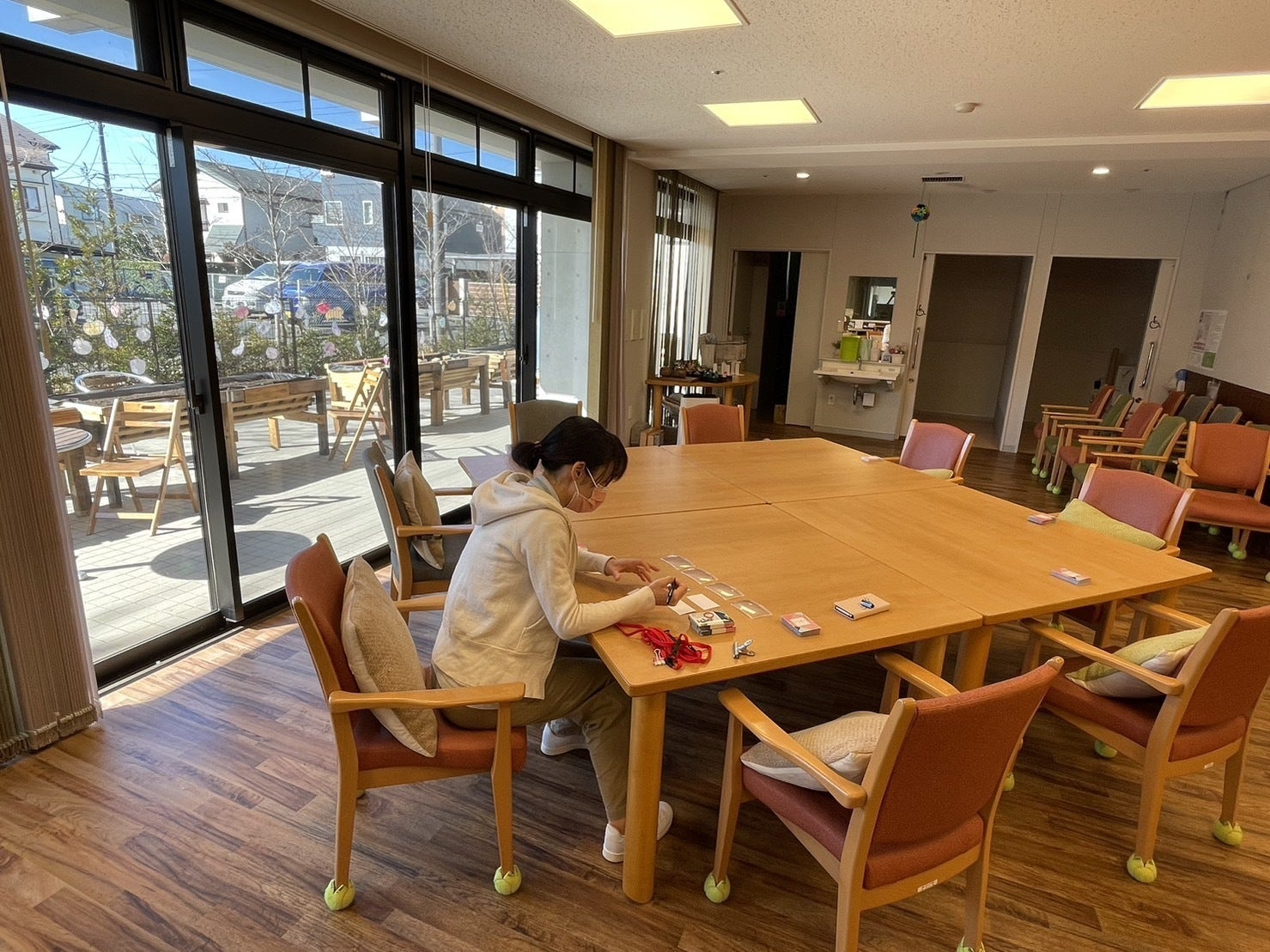 明るい陽が差し込むデイルームで、午前中から会場設営を始めました。冗談を言いながらテーブルや椅子を動かす井口とは対照的に、私は少し緊張していました。