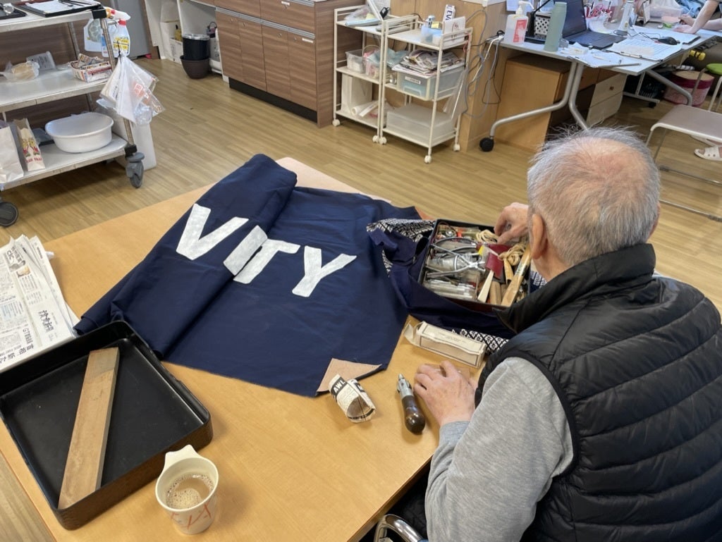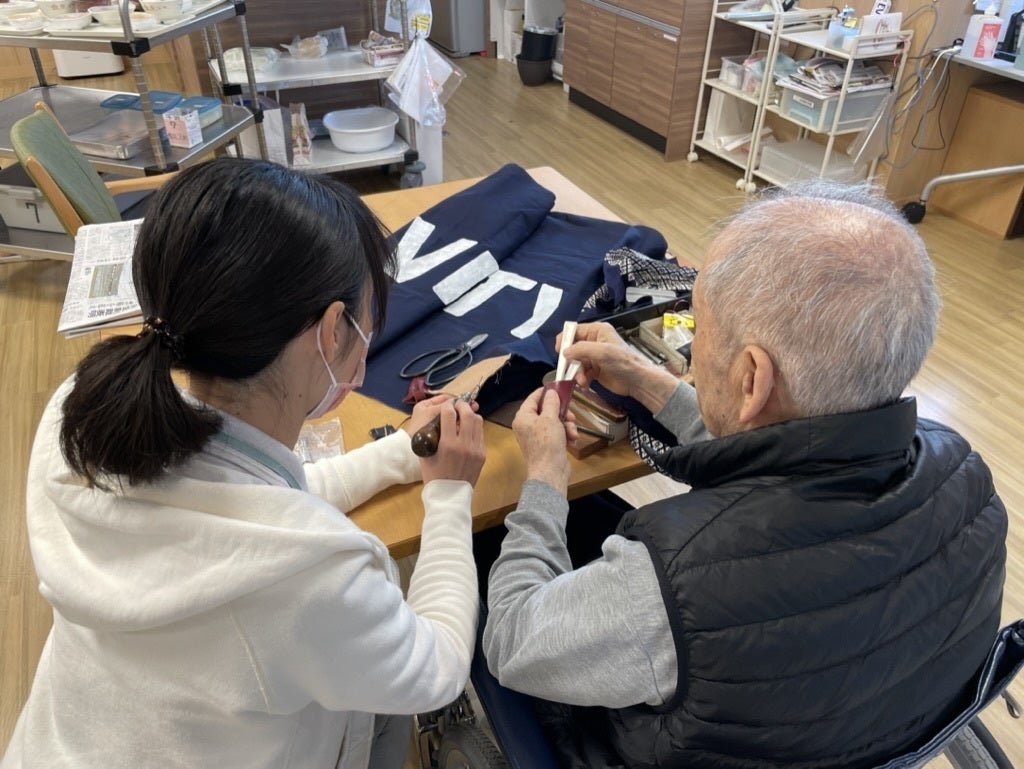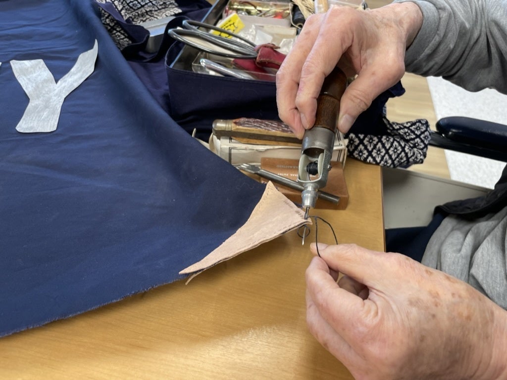 特養入所者の中にレザークラフトの達人がいらっしゃるので、その方にお願いして、旗の補修方法を教えて頂きました。