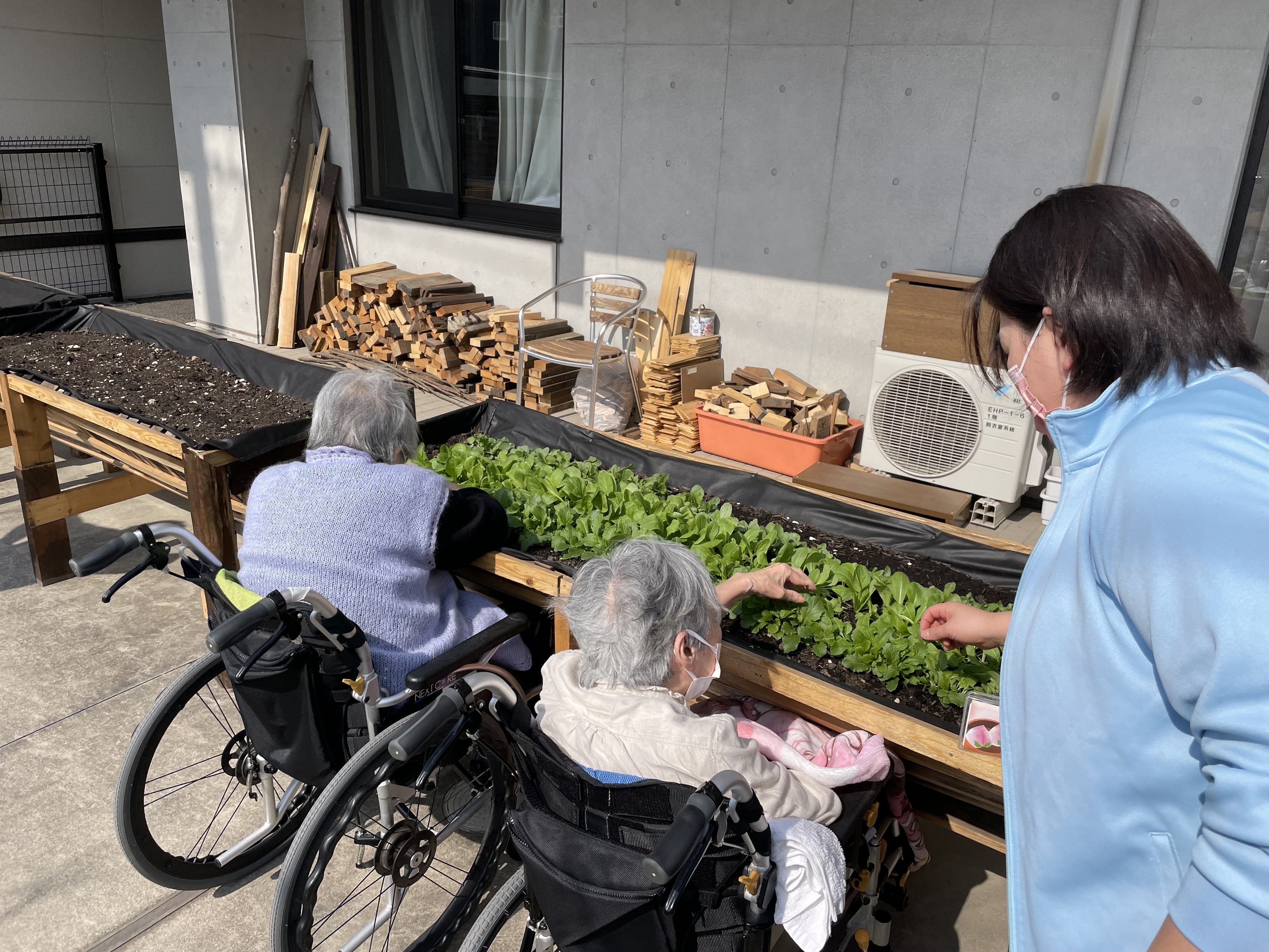 ▲利用者さんたちに間引きをしてもらった小松菜は、その日の夕食のお味噌汁の具として食べていただきました!
