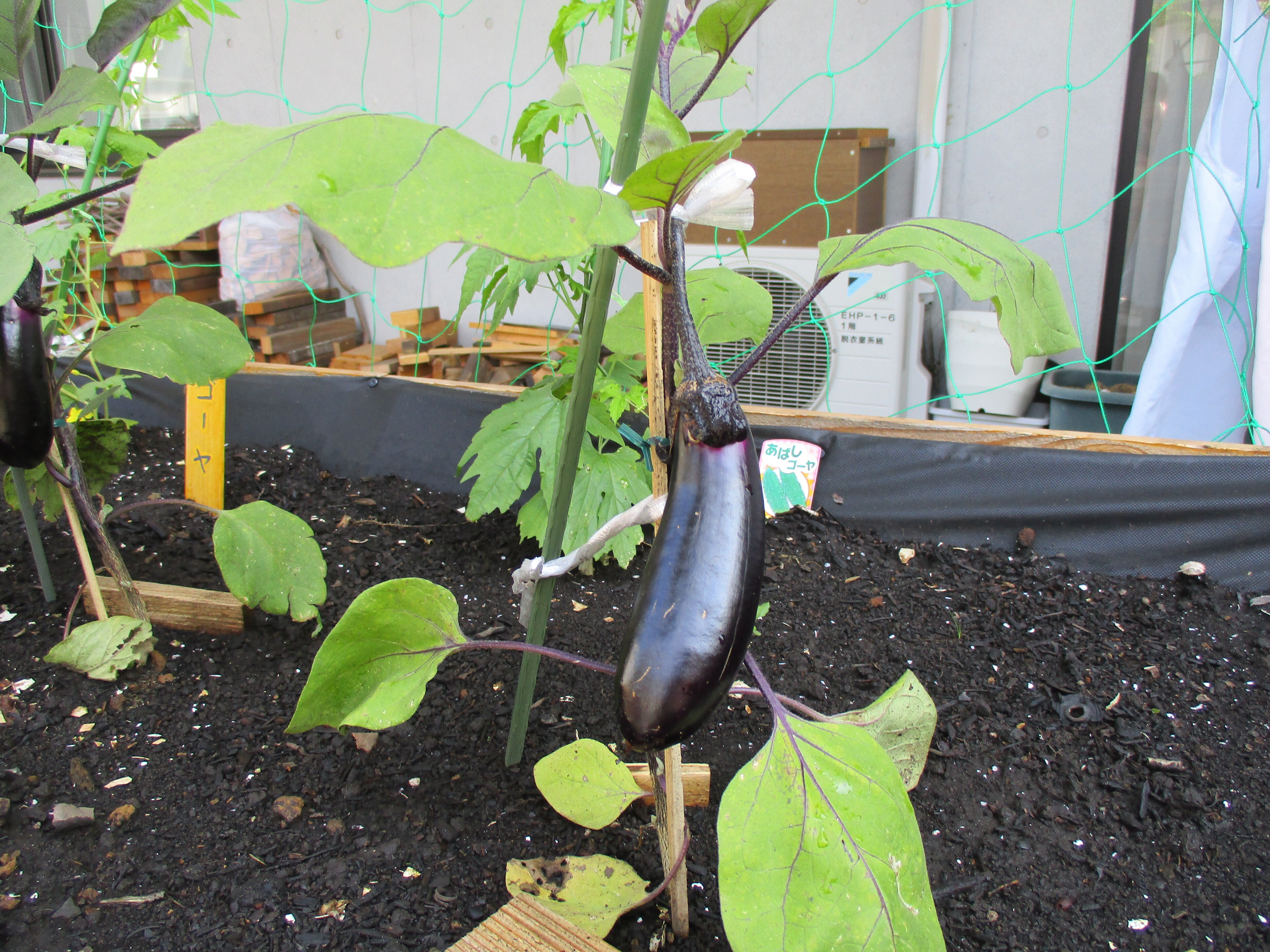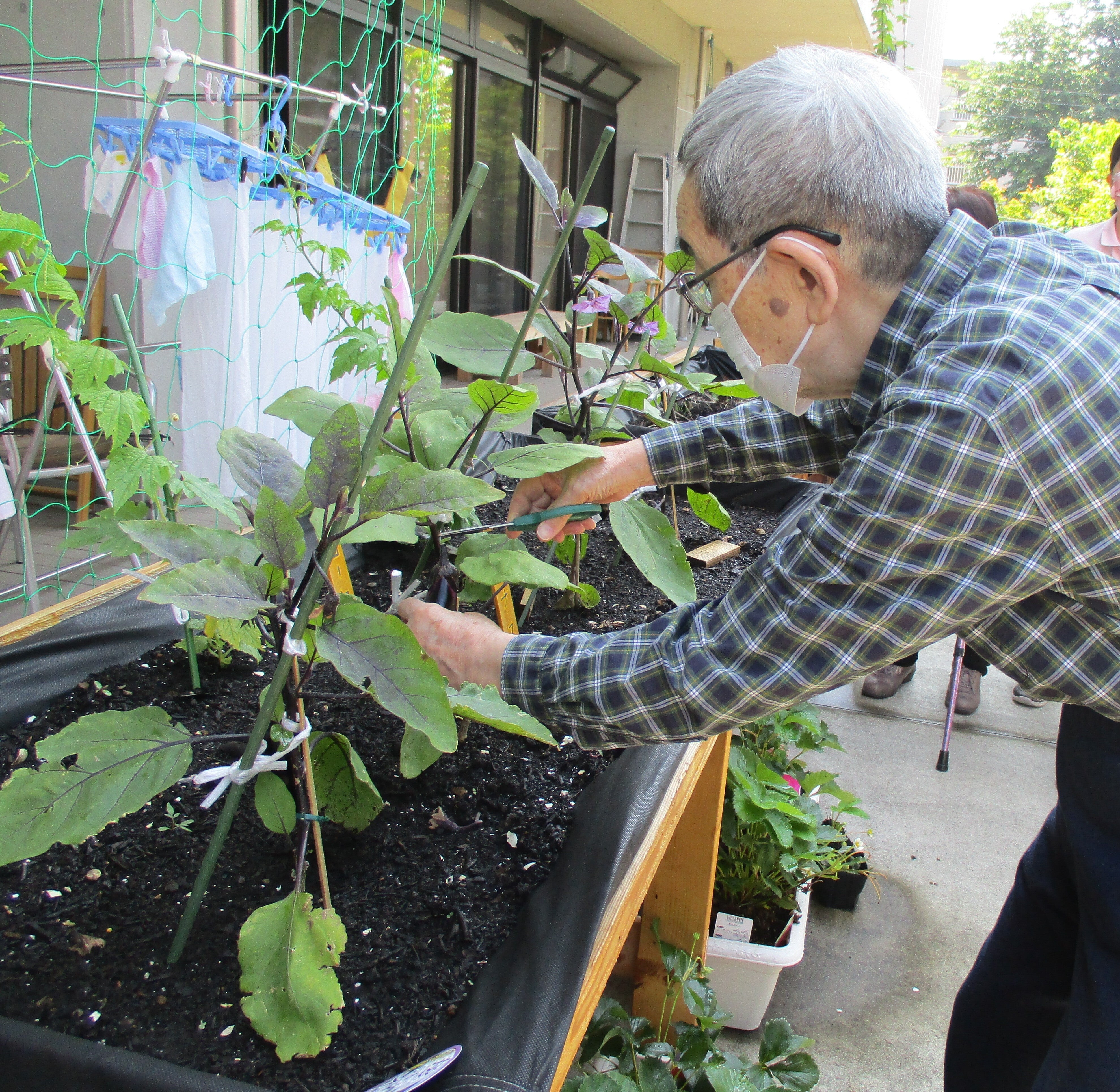 昨日はデイサービスのご利用者4名の方とナスの収穫をしました。