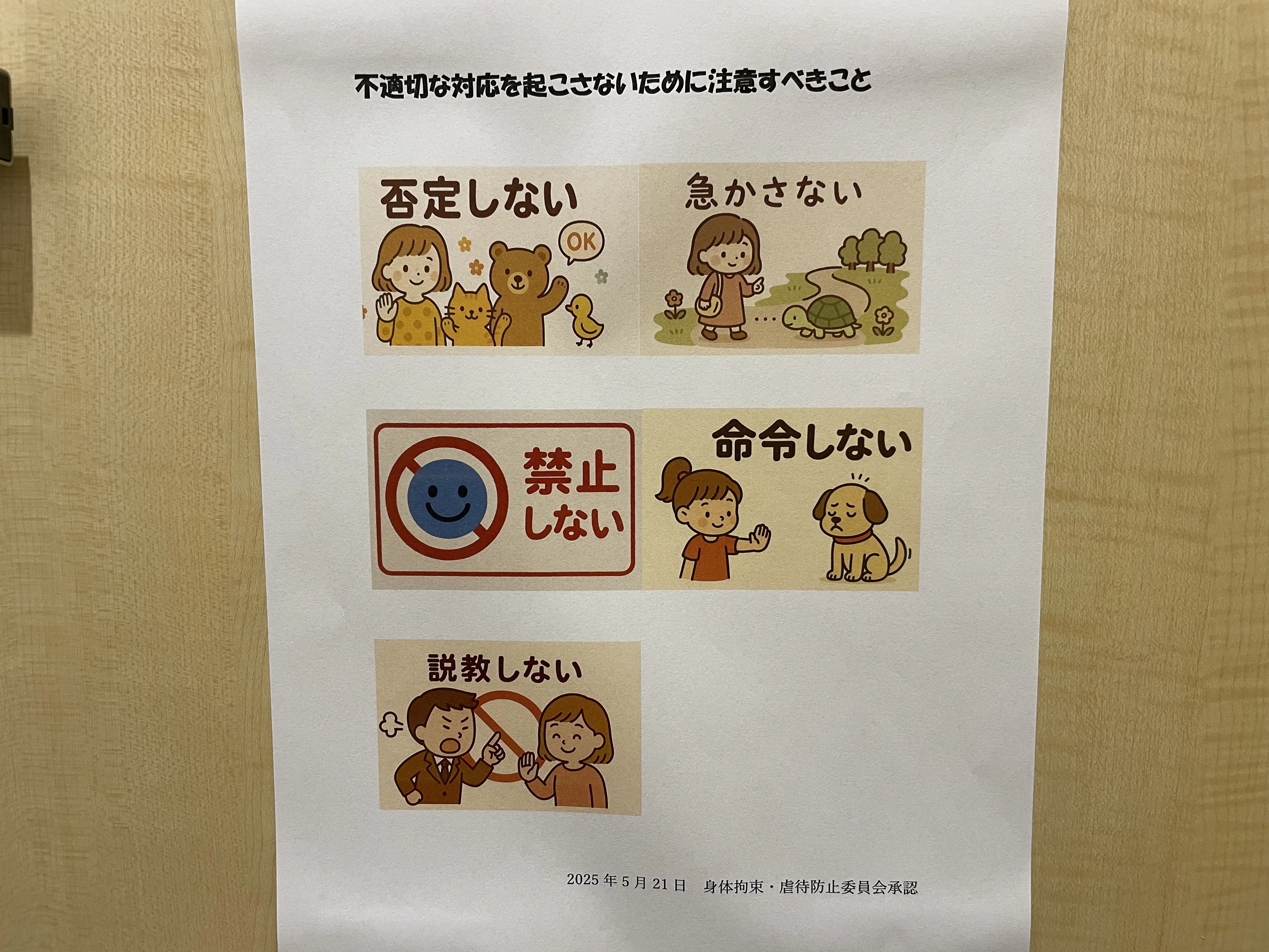 この書面には、かわいらしいイラストとともに、「不適切な対応を起こさないために注意すべきこと」として、「否定しない」「急かさない」「禁止しない」「命令しない」「説教しない」の5つの注意点が分かりやすく掲げられています。一見すると「まるで子ども向けの道徳教育のようだ」と思われるかもしれません。けれども、福祉の現場でたいへん重要な(そして忘れがちな)内容です。