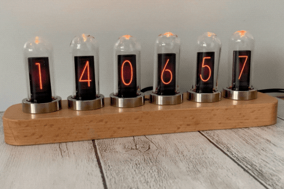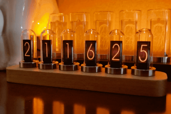 このデジタル時計は、ニキシー管をモチーフに作られています。