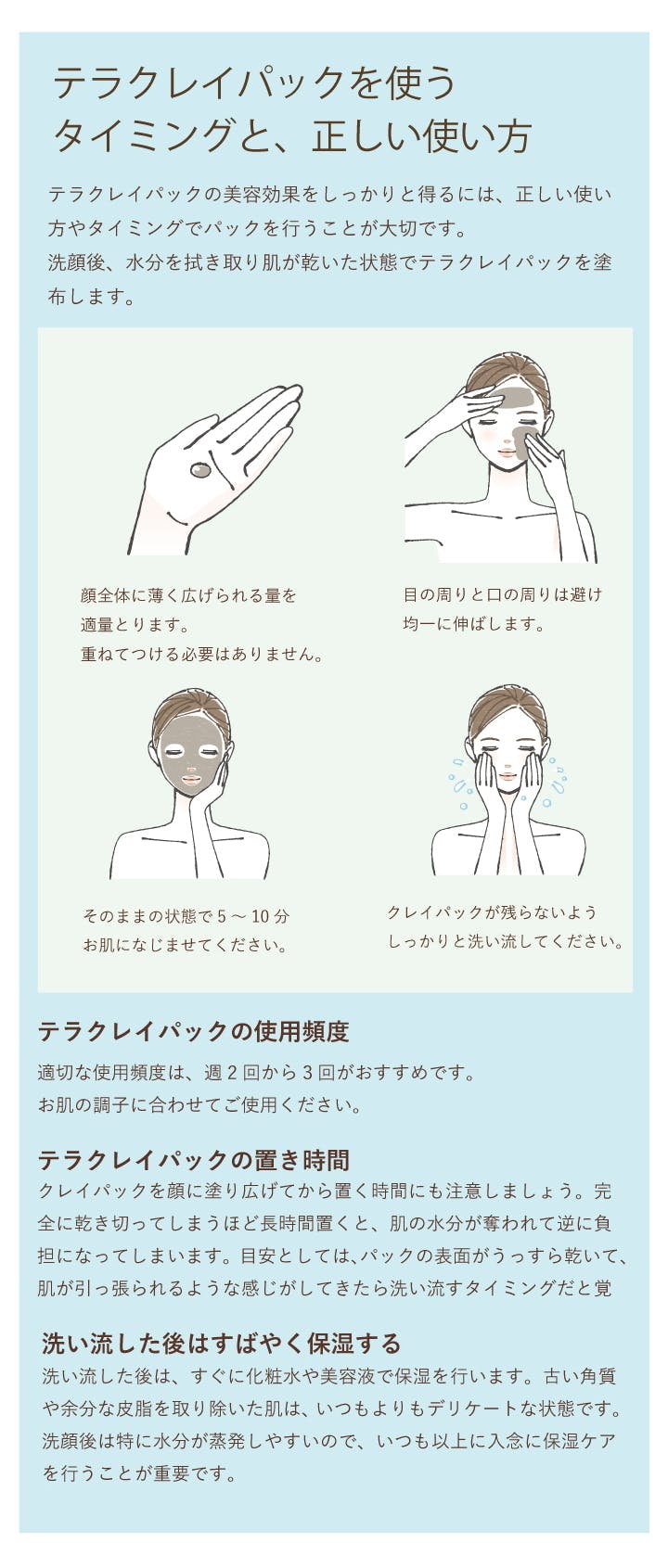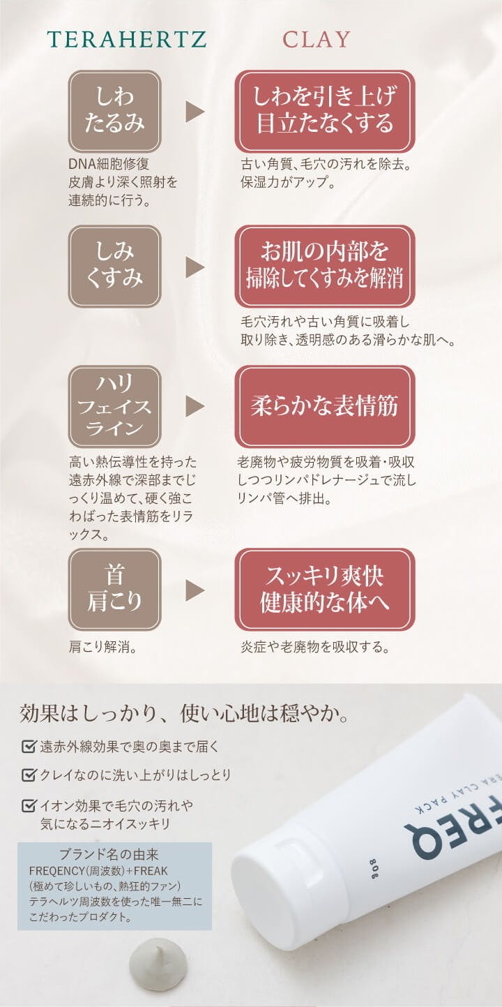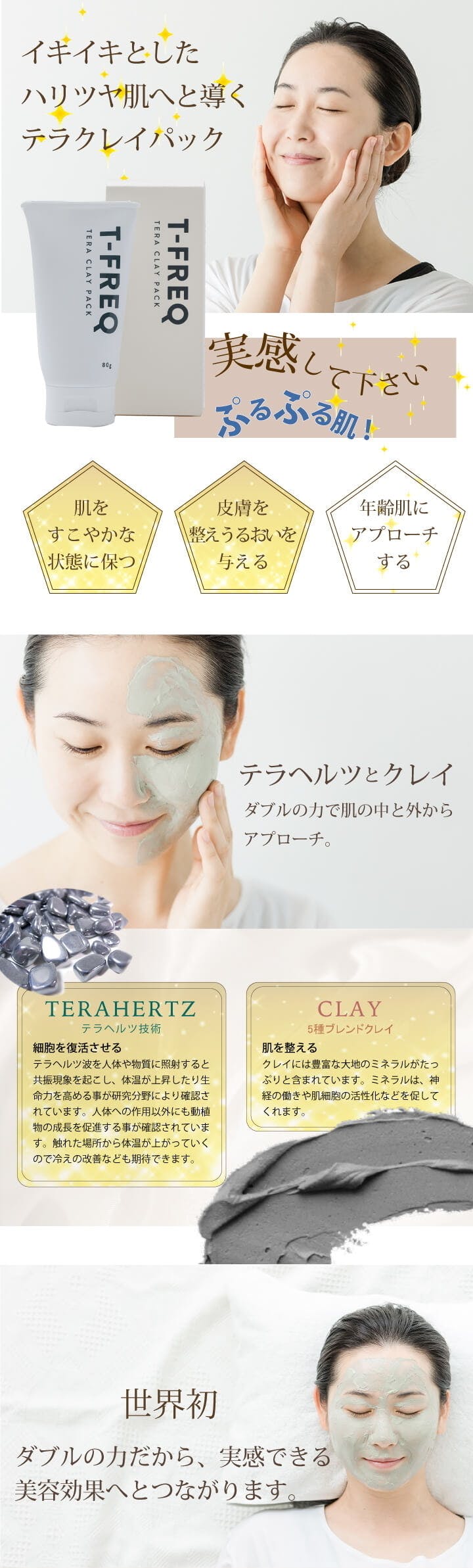 T-FREQテラクレイパック という新しいクレイパックを一人でも多くの人に体験してほしいというのが一番の想いです。このクレイパックは外からパックの成分を肌に届けるだけでなく、お肌そのものの活性化に寄与するとされる成分も配合した新しいクレイパックです。