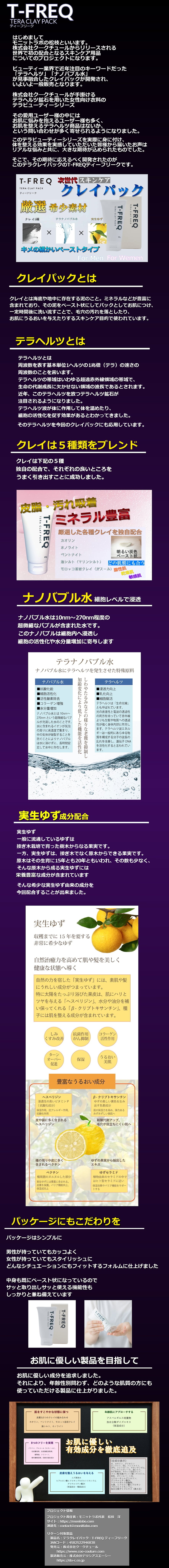 T-FREQを手掛ける(株)ク―クチュールは、テラヘルツと呼ばれる超遠赤外線波長を出す鉱石の成分を繊維に編み込んだ商品を展開、その技術を応用して今回のクレイパックが開発されました。テラヘルツとナノバブル水といった近年注目の技術を取り入れ、厳選クレイや実生ゆずといった希少成分が配合されたこのクレイパックは、画期的な製品になるものと期待が込められています。 このプロジェクトで、より多くの方に利用していただき、皆様のお声を聴きたいと考えています。