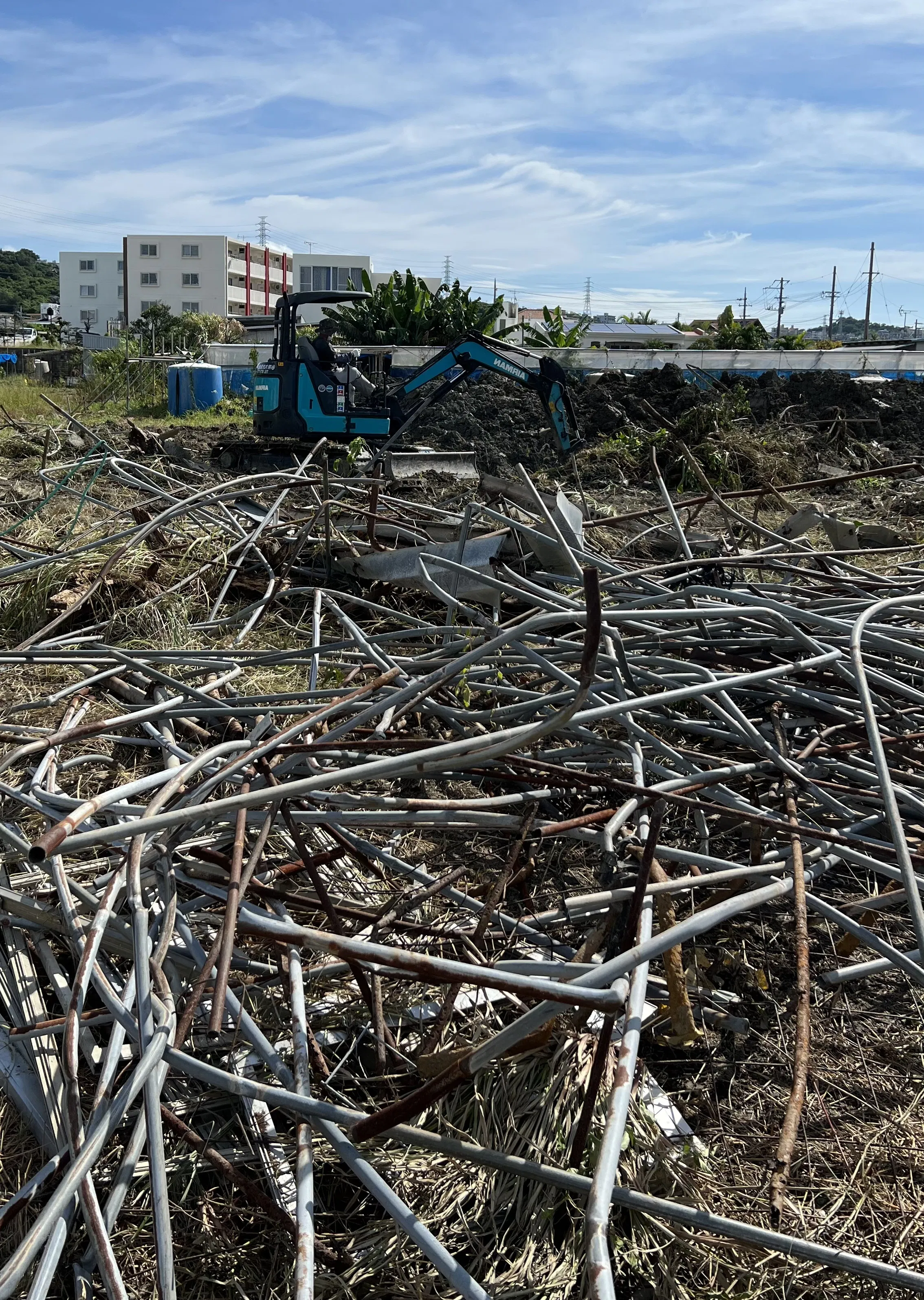 沖縄は連日猛暑です。。本格的に重機整地作業をはじめましたが不慣れな作業や焦りなどから高熱のパイプが上から下から飛んでくる作業内容、、しっかりミーティングをして安全に作業段取りを立て直します。私たろうは午前中はめまい吐き気の症状でダウンしてましたがやる気ってスゴいね。