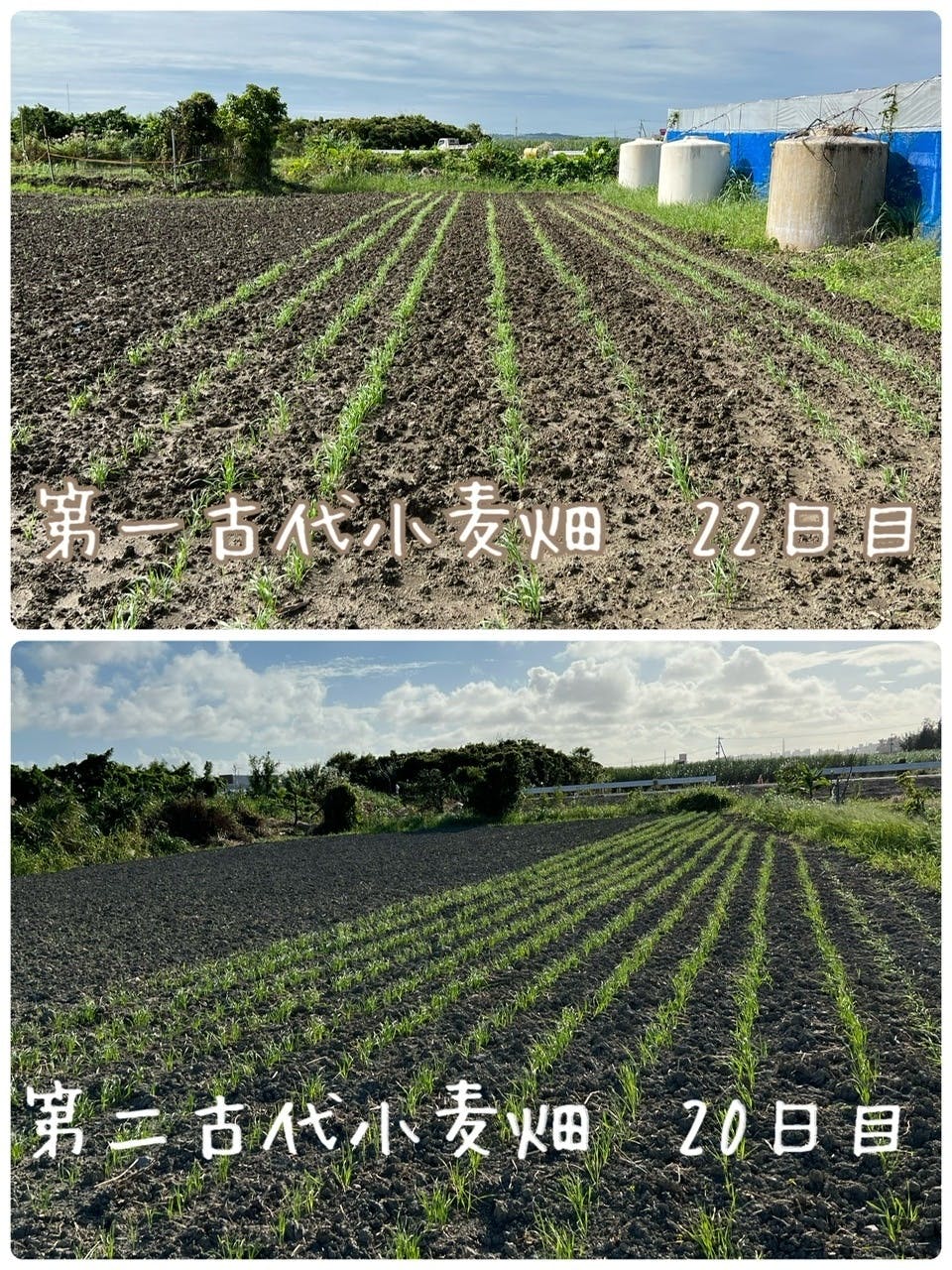 沖縄は大雨続きで小麦畑が水田状態になってました。生育状況を確認しながら進めている感じですが第一古代小麦畑より種蒔き2日遅れの第二古代小麦畑の方が生育状況は良好です。