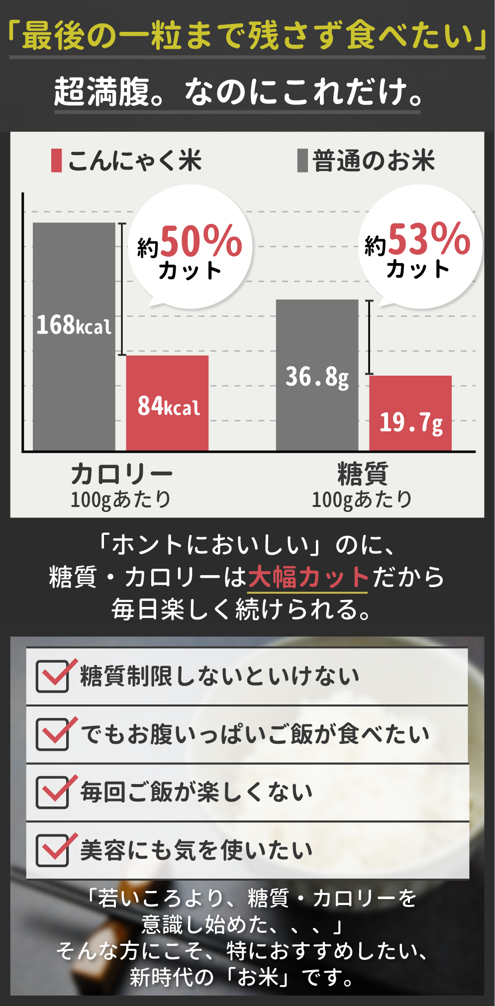糖質、カロリーを大幅にカットした、まんぷくこんにゃく米と