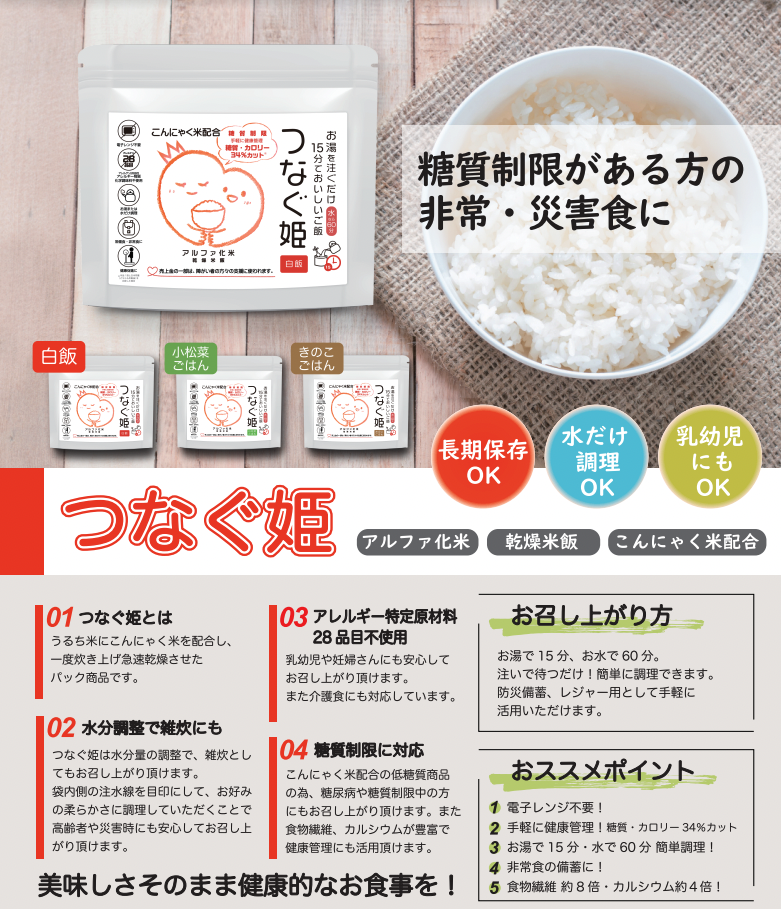 2022/09/01 18:30今日,9月1日は『防災の日』です!備えはしていますか??いざとなってからでは、準備は手遅れです!事前の備えを万全にし、予想のつかない天災に備えておくことが、大切です!「つなぐ姫」は・糖質、カロリー34%カット・食物繊維約8倍・カルシウム約4倍でありながら、【お湯でたった15分】【水で60分】注いで待つだけで食べることができます!●こんな方におすすめ・糖質、カロリーをカットしながら、即席で食べたい!・最近地震や大雨などの災害が多いので、非常食として、災害備蓄したい!・流行りのキャンプ飯で、カロリーを気にせず食べたい!●商品特徴①電子レンジ不要!②手軽に健康管理!糖質・カロリー34%カット③お湯で15分・水で60分 簡単調理!④非常食の備蓄に!⑤食物繊維 約8倍・カルシウム約4倍!●商品詳細つなぐ姫とは:うるち米にこんにゃく米を配合し、一度炊き上げ急速乾燥させたパック商品です。アレルギー特定原材料 28品目不使用:乳幼児や妊婦さんにも安心してお召し上がり頂けます。また介護食にも対応しています。水分調整で雑炊にも:つなぐ姫は水分量の調整で、雑炊としてもお召し上がり頂けます。袋内側の注水線を目印にして、お好みの柔らかさに調理していただくことで 高齢者や災害時にも安心してお召し上がり頂けます。糖質制限に対応:こんにゃく米配合の低糖質商品の為、糖尿病や糖質制限中の方にもお召し上がり頂けます。また 食物繊維、カルシウムが豊富で健康管理にも活用頂けます。※当製品は、あくまでも糖尿病や成人病の予防、ダイエットのサポートをする製品です。病気の治療を目的とした製品ではありません。 ●お召し上がり方お湯で15分、お水で60分。 注いで待つだけ!簡単に調理できます。 防災備蓄、レジャー用として手軽に活用いただけます。ぜひたくさんの方に、お試しいただけたらと思います!引き続き、よろしくお願い致します! もっと見る