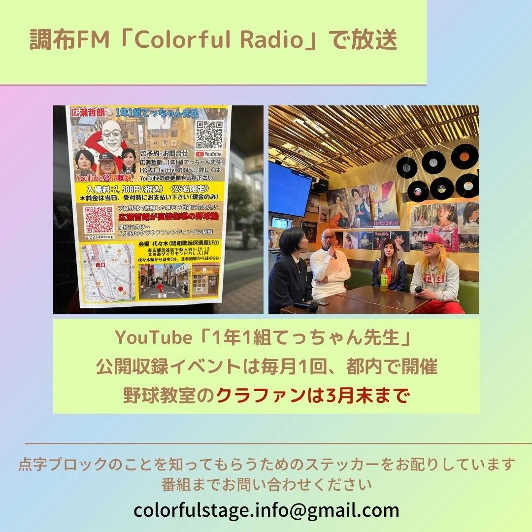 2023/03/05 19:08色々な方にご協力して頂いております。皆様のご支援、本当に感謝しております。子供達のためにも精一杯頑張りますので引き続きご声援よろしくお願いいたします。「Colorful Radio」(調布FM)にて広瀬哲朗の野球教室やクラファンをご紹介頂きました。 もっと見る告知をさせて頂きました