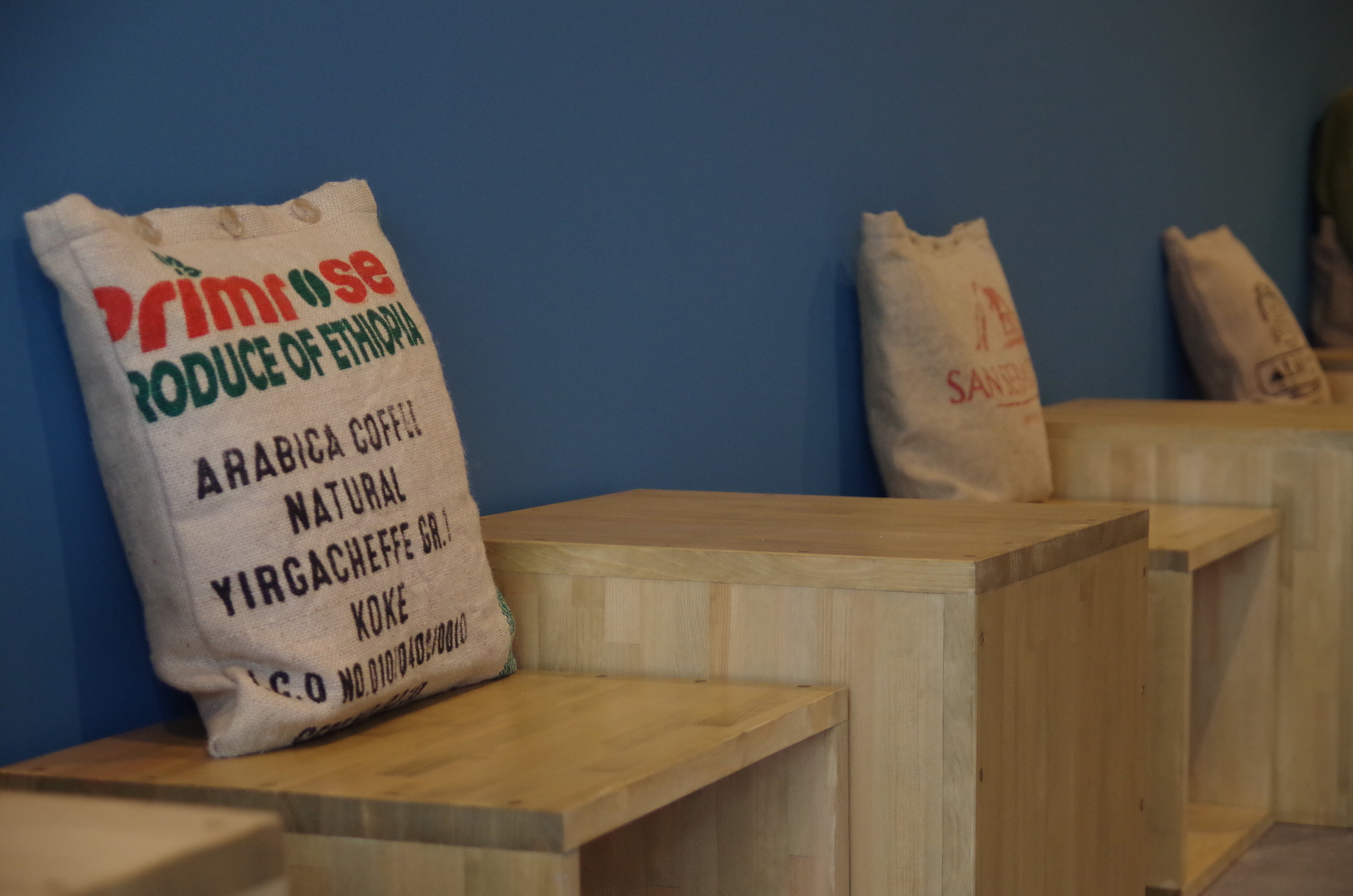 みんなで作った椅子とテーブルが5組。椅子にはKuusi Clothingさん製作のコーヒー麻袋リメイククッション。