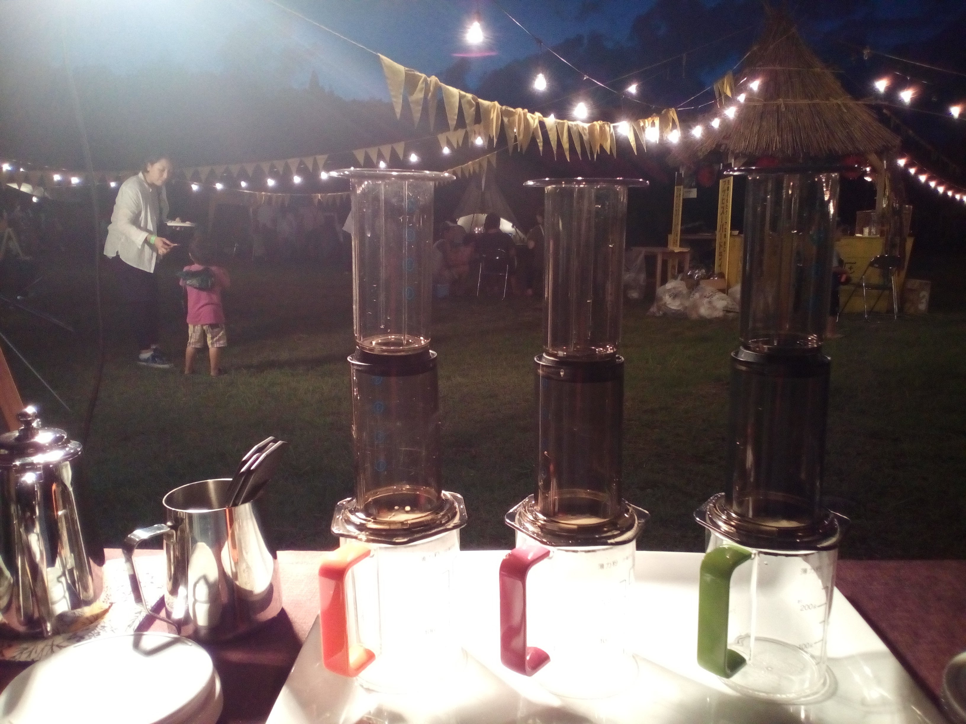 最初の焙煎機 2011年に帰郷後、小さな焙煎機を購入。看護師を続けながら夜な夜な焙煎を試行錯誤する日々が始まりました。どうにか形になった2013年、ネットショップのコーヒー豆販売とイベント出店を開始。ちょうどマルシェが数多く行われるようになった頃で、毎週末どこかしらに出店する生活を6年程続けました。出店するたびに色々な人と繫がり、ご縁を頂き、海、山、さくらんぼやぶどう農園、高齢者施設、深夜のクラブ…色々な場所でコーヒーを淹れ続けました。鶴岡市のある庄内平野は、市街地から少し離れると田園が広がり、更に少し足を伸ばせば海も山も近い。数々のトラブルに見舞われながらも(特に風!)自然豊かな場所でコーヒーを淹れ続けたことは、非常に良い経験になり、鍛えられました。景色の良い所でコーヒーを飲むのはもちろん最高ですが、そんな場所で多くの方にコーヒーを淹れて飲んでもらうのは、実に得難い、素晴らしい体験でした。