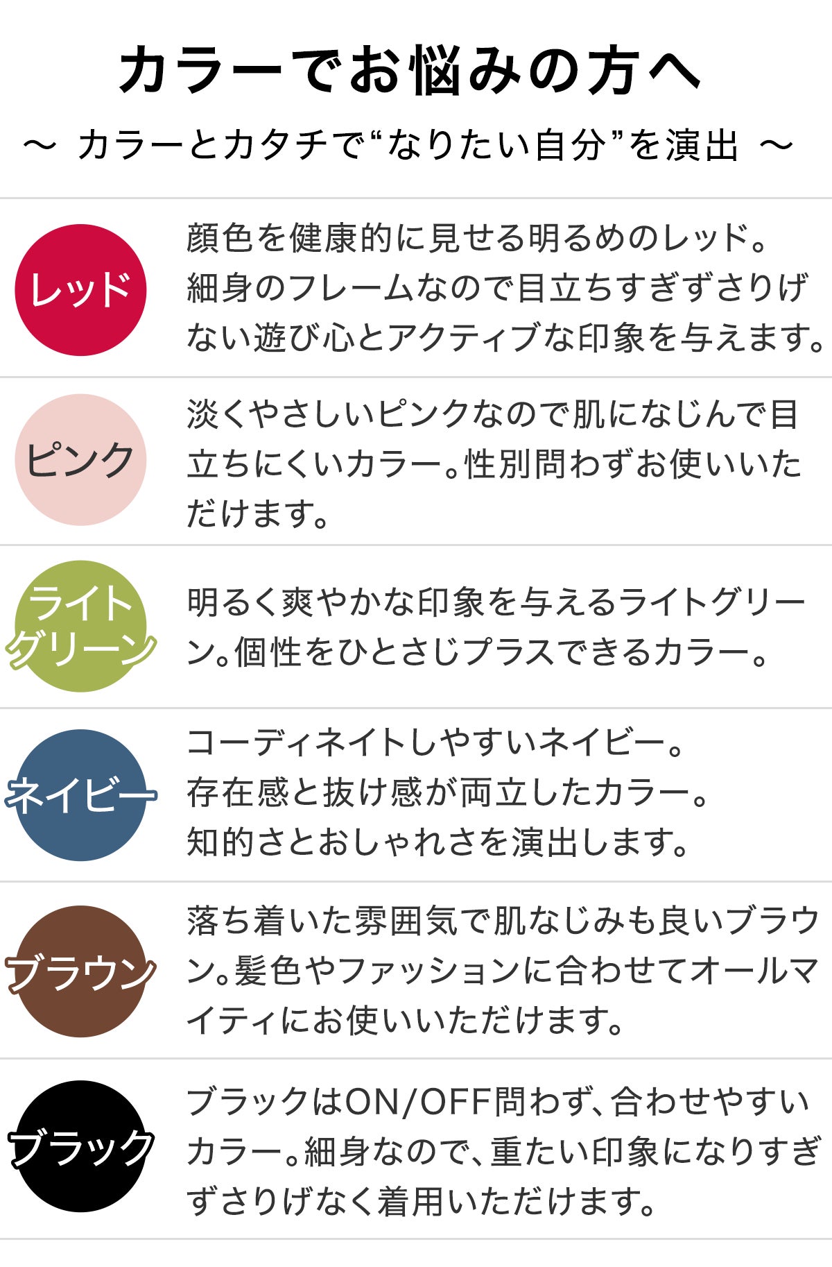 ファッションやシーンに合わせて豊富なカラーバリエーションからお選びいただけます。