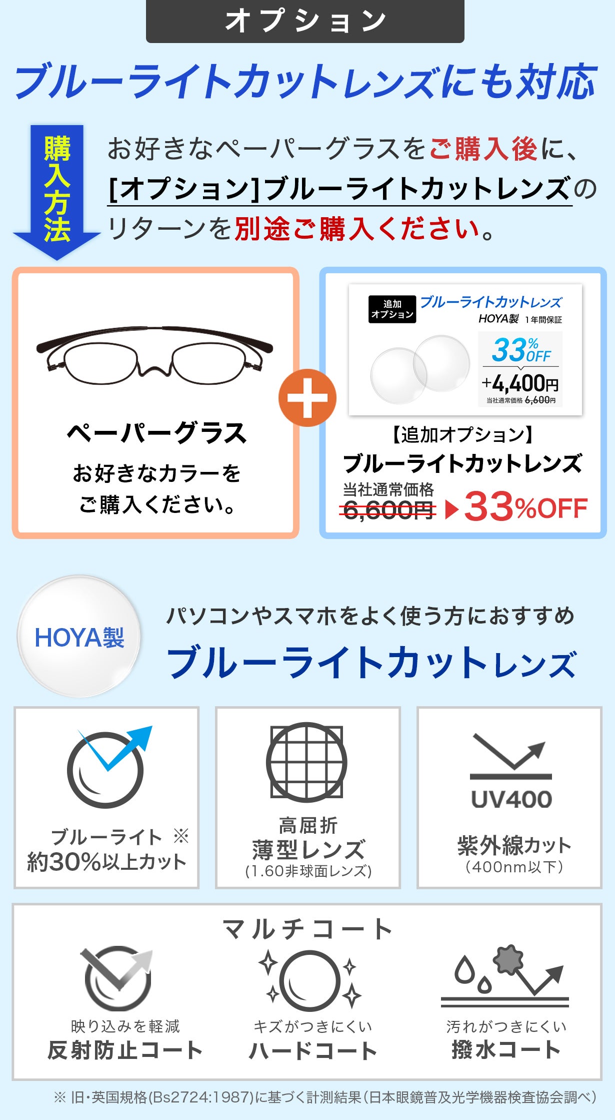 ブルーライトカットレンズ(HOYA製):ブルーライトカット、UVカット、マルチコート