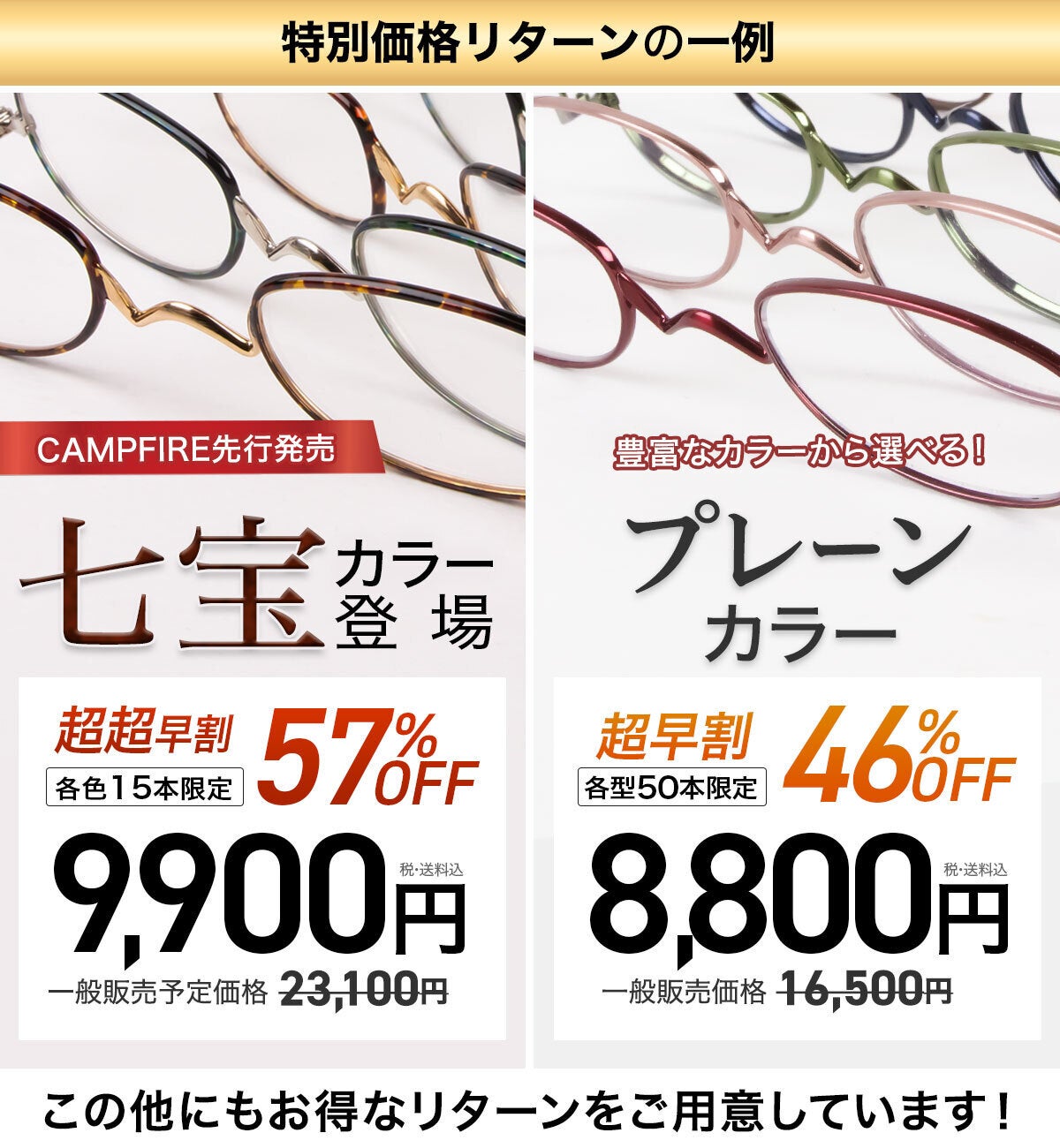 「かけ心地が良くなった!」とご好評いただいているペーパーグラス・Nスタシリーズの中から、先行販売となる『七宝カラー』と、人気の『プレーンカラー』を特別価格でお届けいたします。