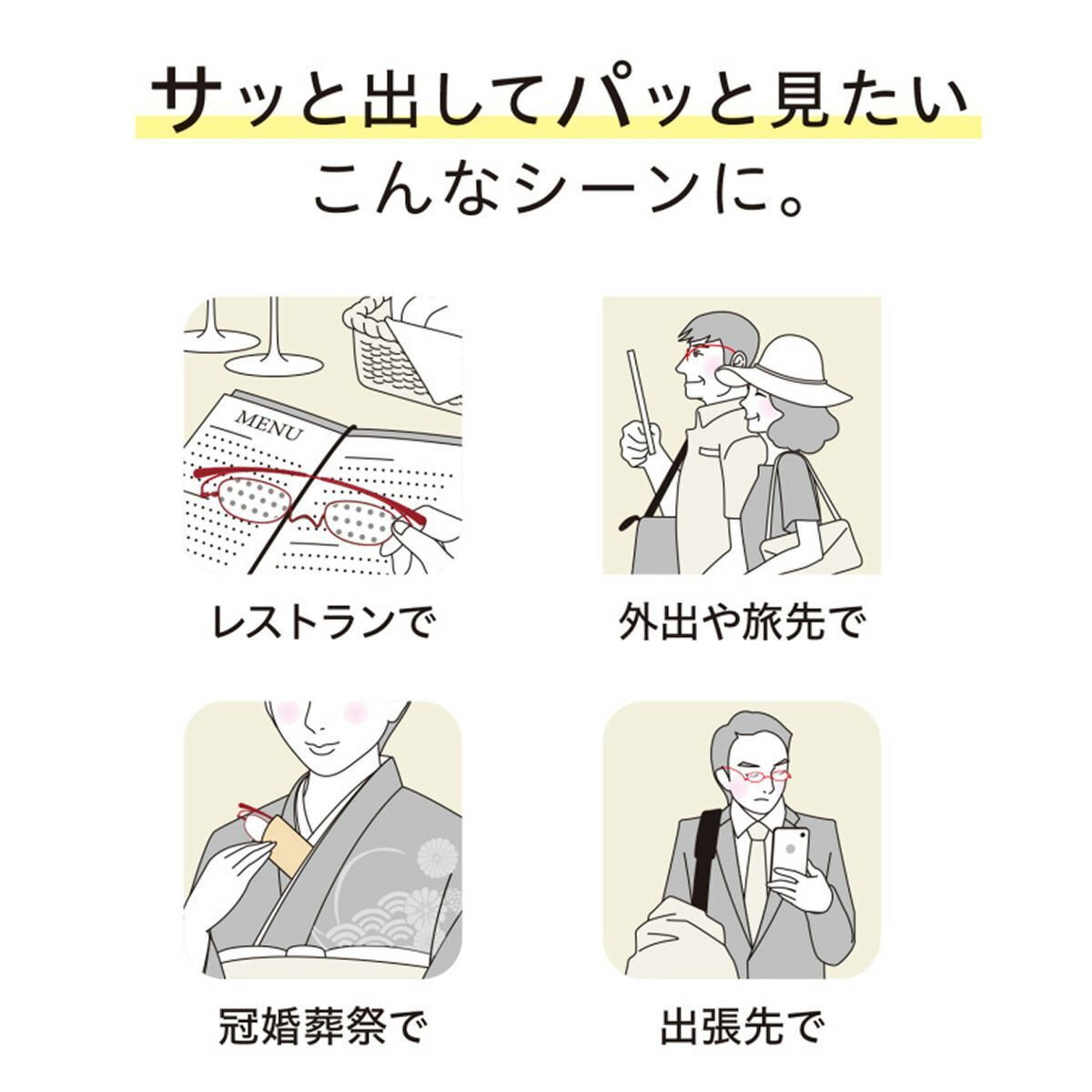 めがねの持ち運びによるわずらわしさから解放され、おしゃれなメガネでいくつになっても好奇心を奪われることなく人生をアクティブに楽しんでいただきたい。
