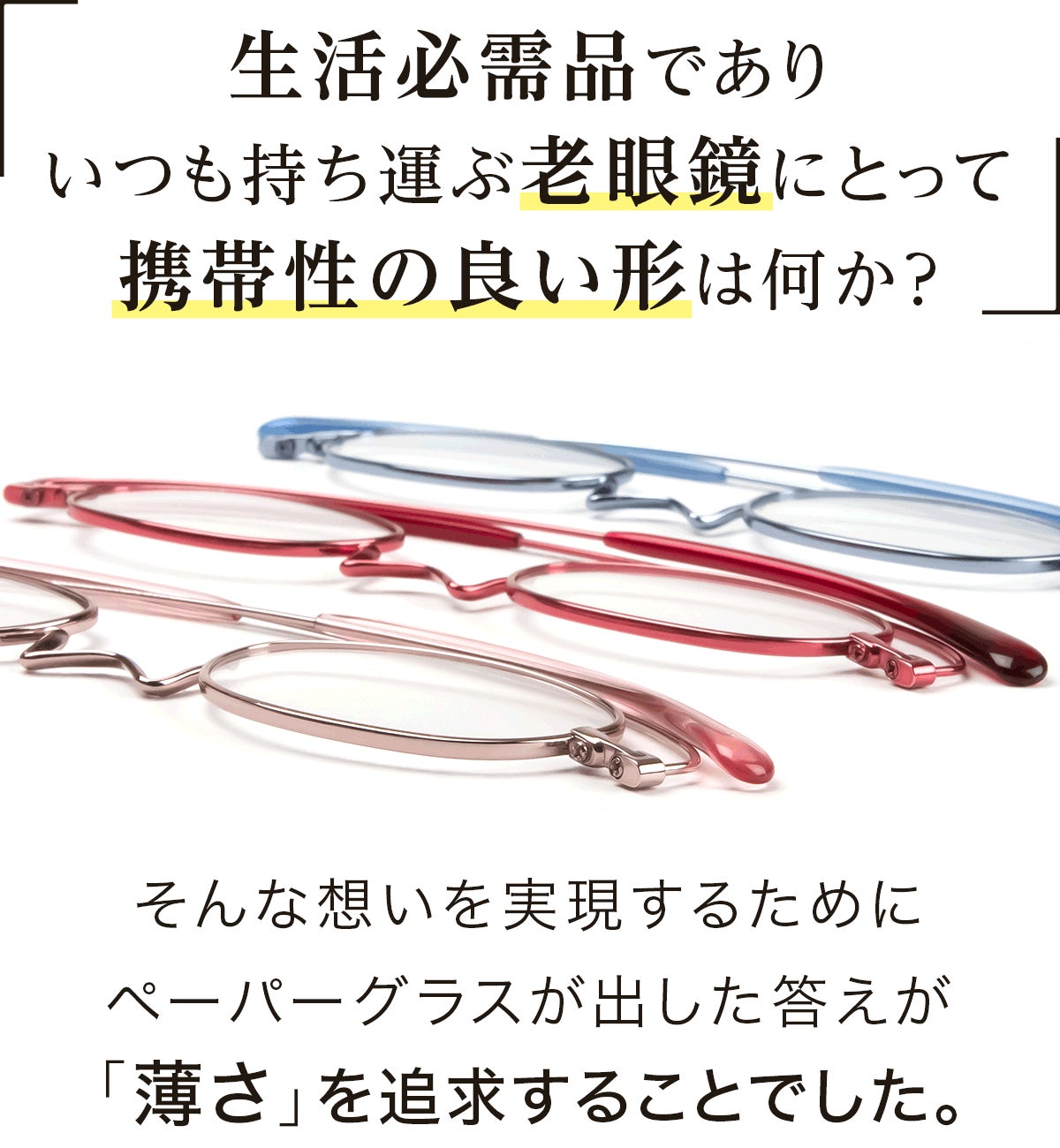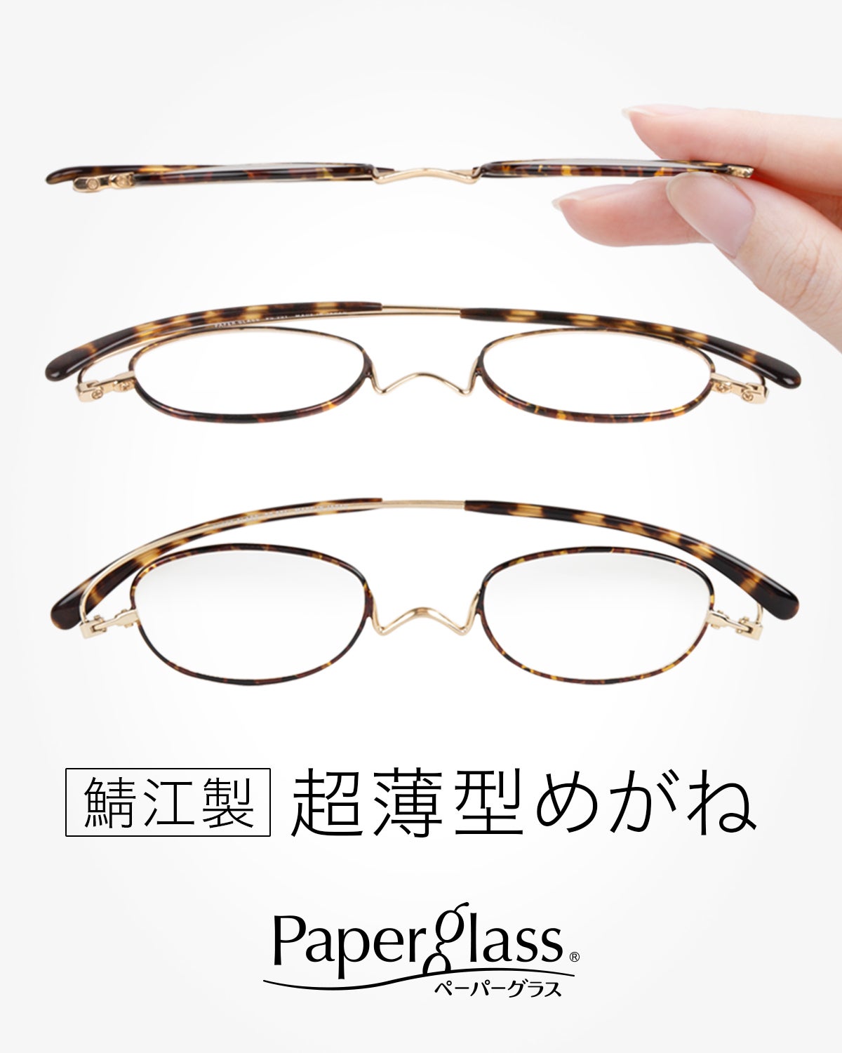 ペーパーグラスは眼鏡の街・鯖江の技術力を活かした独自の構造により、紙のように薄くフラットになる超薄型リーディンググラス(老眼鏡)です。