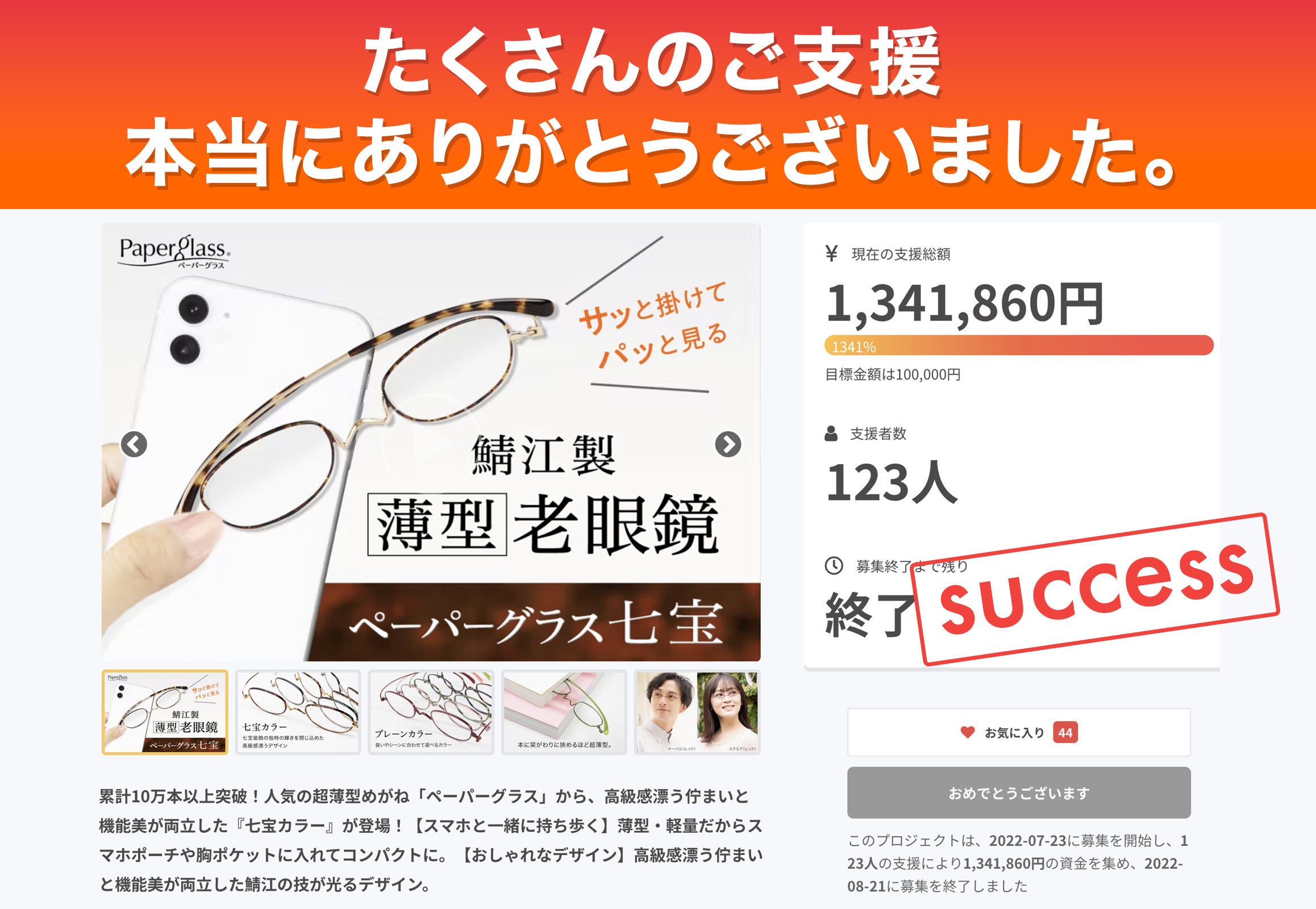 ご支援者の皆様この度は『ペーパーグラス』のプロジェクトをご支援いただき、誠にありがとうございます。多くの方から温かいご支援をいただき、昨日8月21日をもちまして無事プロジェクトが終了いたしました。ペーパーグラスの他のモデルもご愛用いただいているという大変嬉しいお言葉や、前回プロジェクトからのリピート下さった方、期待のコメントはプロジェクトを進めるにあたり大変励みとなりました。これからも多くの方から永く愛されるような良い商品をお届けできるよう努めて参ります。これより、発送準備に移ってまいります。リターンの発送は【9月末】を予定しています。なるべく早くお届けできるように発送準備を進めてまいります。お届けまでどうぞ楽しみにお待ちいただけますと幸いです。-------------■重要:住所変更期限のご案内もしお届け住所が変更になるようでしたら、【2022年9月2日(金)】までに「メッセージ」にてご連絡ください。※「支援したプロジェクト」からは備考欄・住所変更できませんので「メッセージ機能」にて変更をお知らせください。<メッセージ送信方法>(1)CAMPFIREへログイン後、下記URLにアクセスhttps://camp-fire.jp/mypage/messages/select(2)対象となるプロジェクトを選択(3)メッセージを入力後【確認画面へ】を選択(4)最後に【送信する】を選択▼参考:支援時に記載したお届け先・備考欄の情報を変更したいhttps://bit.ly/3My9FKt-------------改めましてこの度はご支援いただきまして誠にありがとうございました。お届けまで引き続きよろしくお願いいたします。▼プロジェクトページはこちらhttps://camp-fire.jp/projects/view/609100