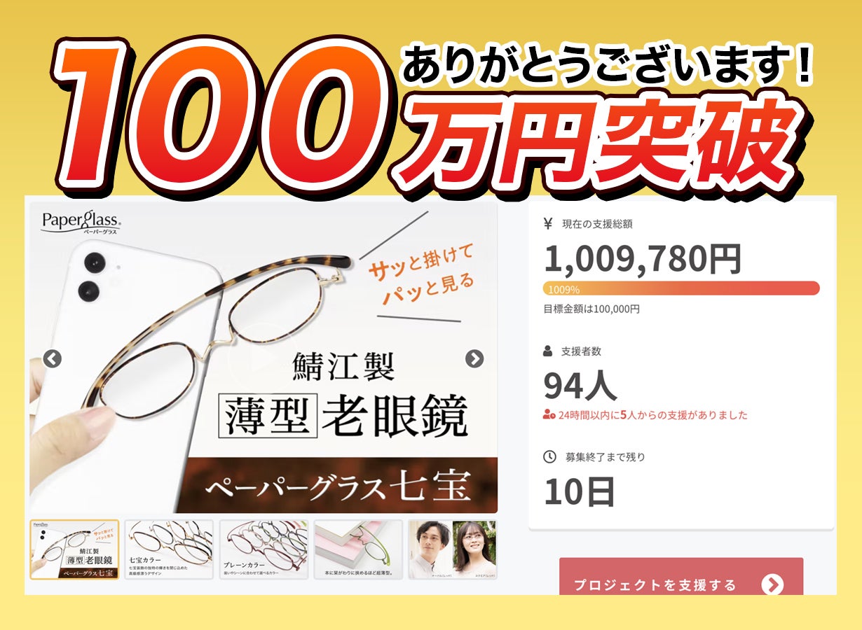 いよいよプロジェクト終了まで【残り33時間】を切りました!!検討中の方で迷われている方がいらっしゃいましたら、どうぞお早めにご購入ください。引き続きよろしくお願いいたします。▼プロジェクトページはこちらhttps://camp-fire.jp/projects/view/609100■普段使いやファッションに合わせやすいプレーンカラーペーパーグラスは用途やライフスタイルに合わせてお選びいただけるよう、多彩な形・カラーをご用意しています。ON/OFFシーンや装いに使い分けられるカラーバリエーションで大好きな色に囲まれてときめきの毎日を。めがねの街・鯖江で私たちが丁寧に1本1本手作りしているペーパーグラスをぜひ手に入れてください。▼プロジェクトページはこちらhttps://camp-fire.jp/projects/view/609100
