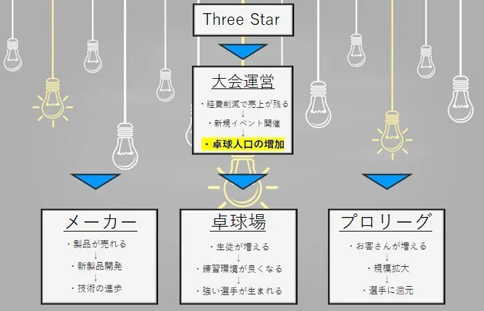 選手や大会運営団体、卓球場、メーカーなど1つ1つが繋がりあって今の卓球界があると思います。その卓球界に新しい循環を生むことにThree Starは「挑戦」します!