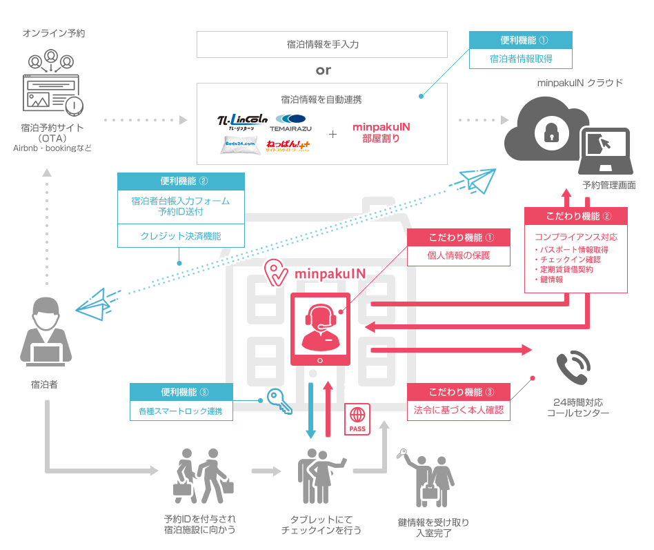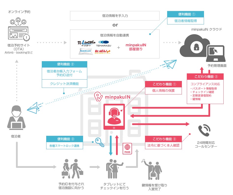 予約すると送られるURLから必要な情報を入力、発行されるQRコードを宿泊当日にモニターにかざすだけ。