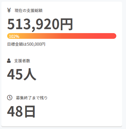 合計45名様にご支援いただき、本当に心より厚くお礼申し上げます。