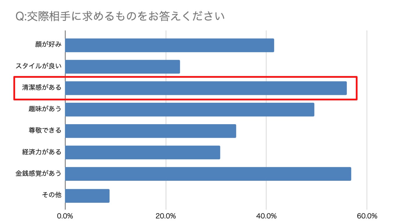当社が調査したアンケートデータによると「交際相手に求めるもの」は男女共に『清潔感がある』ことが最も重要であると言う結果が出ています。