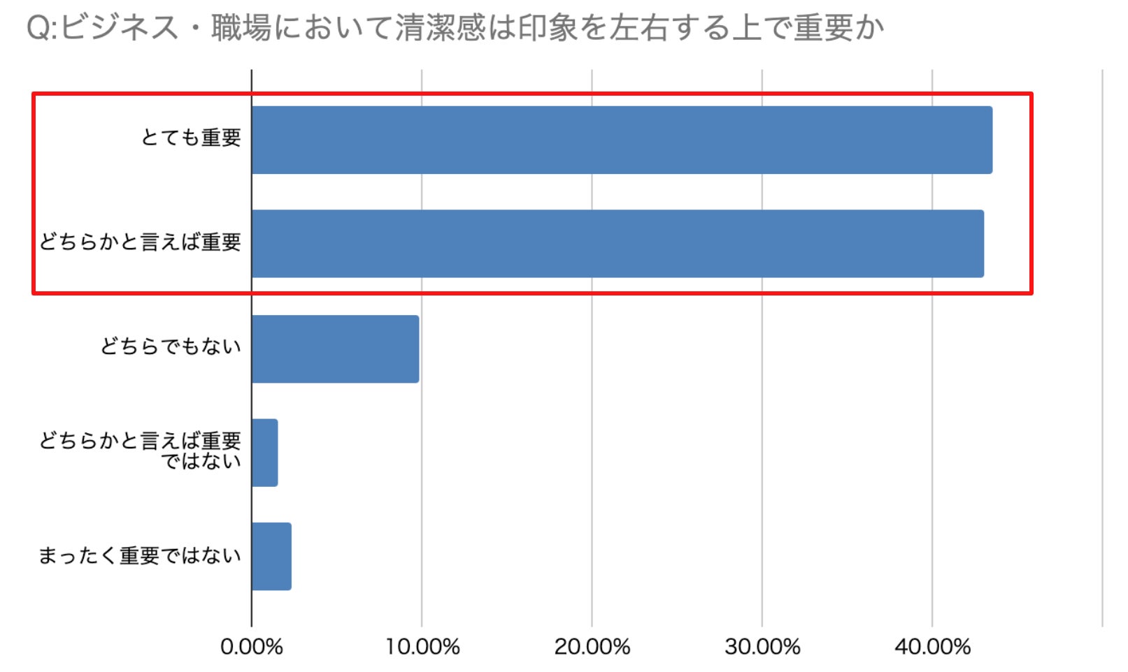 また、ビジネスシーンにおいても身だしなみの清潔感が初対面の人の印象を左右する重要度を聞くと、87%が重要であると回答していることからもプライベート・ビジネス双方において「清潔感」は対人関係を良好にする上で非常に重要な要素であると私共は考えています。